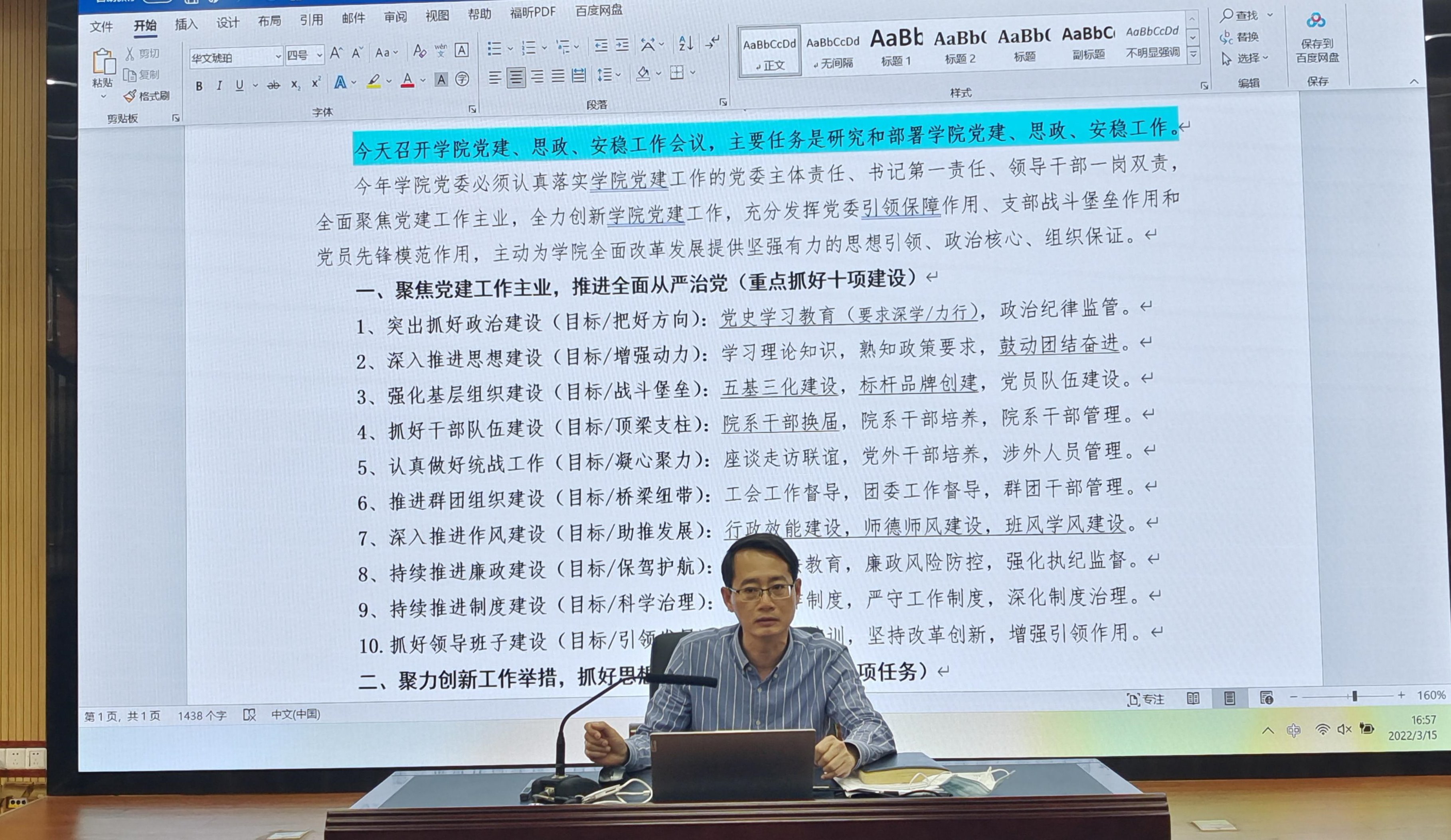 3月15日下午,公司党委在公司融通报告厅召开2022年公司党建、思政、安稳工作会议,公司党委黄开勇书记作工作部署讲话,公司全体教职工参加会议,陈碧兰副经理主持会议。
