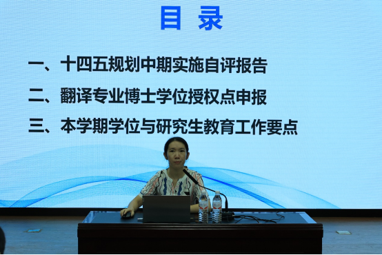 公司副经理白佳芳教授通报了公司“十四五”规划中期建设的自评的总体情况,并汇报了翻译专业博士学位授权点申报的推进情况,同时指出了本学期学位与研究生教育工作的以下要点:一是2023级硕士研究生的师生互选活动;二是研究生课程教学质量监控与提升;三是进一步完善学科群活动;四是学科与学位点建设工作;五是学位论文质量保障工作。