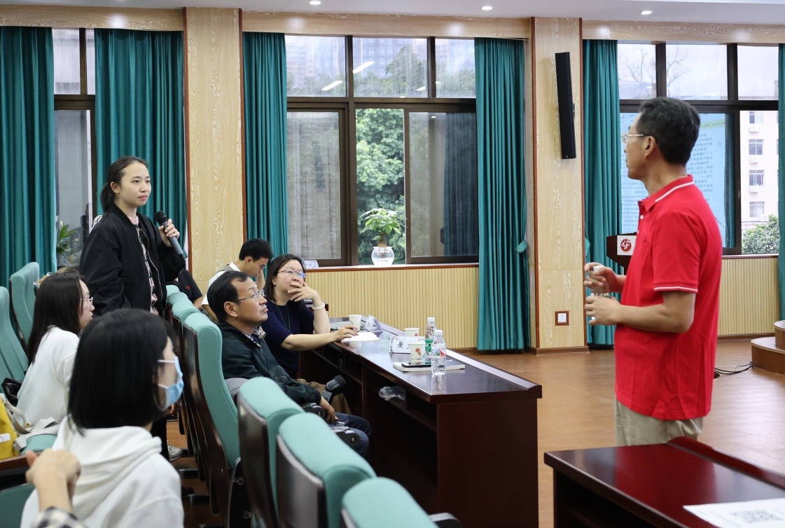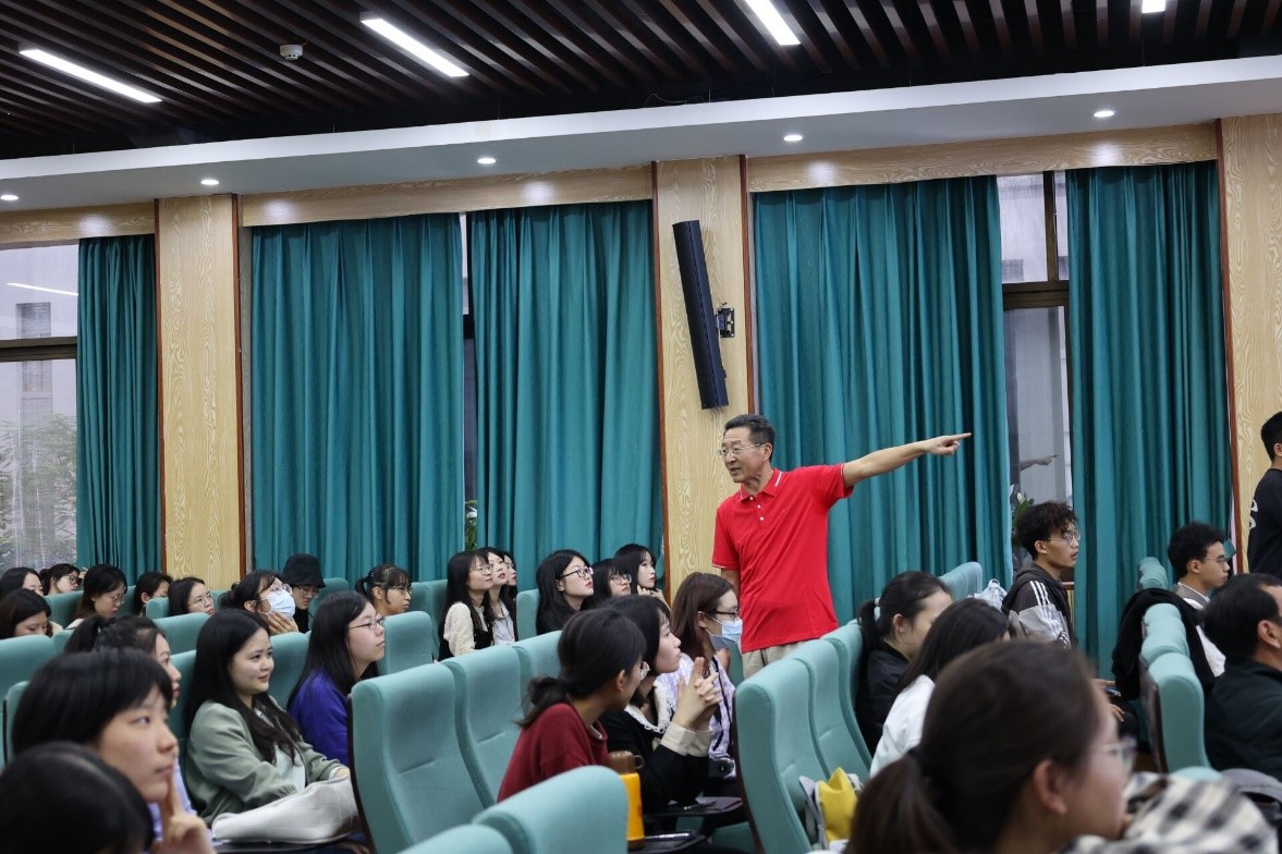 黄教授认为处理英汉互译的关键在于将英语中的非动词与汉语当中的动词互相转化,基于这个新观念,黄教授提出“英汉互译六宝”:英语名词转汉语动词、英语介词汉译动词化、英语形容词汉译动词化、英语副词汉译动词化、具体形象抽象化和抽象命题形象化。谈论到隐喻的翻译方法时,黄教授援引纽马克的理论,给出了精炼的总结:零翻译迁移、异文化意象替换、把隐喻转换为本义、把本义转化为隐喻。黄教授对这四种翻译方法给出详尽的理论解释和例子分析,独特精到的英汉互译实践赢得在场同学们阵阵掌声。