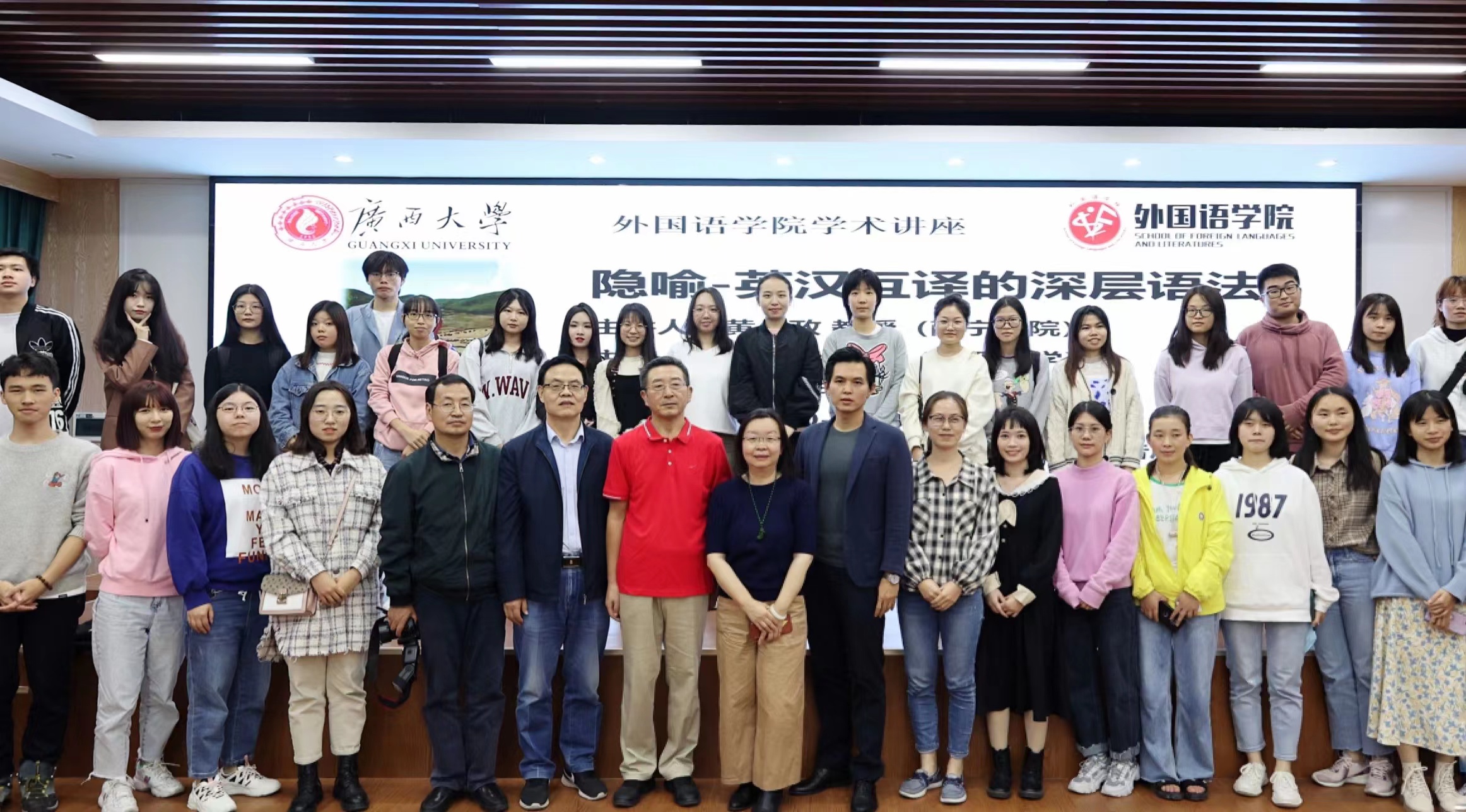 11月16日下午,太阳成集团tyc122cc214报告厅成功举办了“隐喻-英汉互译的深层语法”的学术讲座。南宁公司黄少政教授主讲,为太阳成集团tyc122cc众多师生讲述英汉互译的底层逻辑和对“隐喻”的新观点。讲座由陈兵教授主持,公司老师和员工,特别是翻译专业的员工前来聆听。