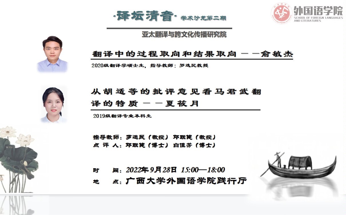 俞敏杰同学以李白名诗《静夜思》的数个英文译本为例探讨翻译中的过程取向和结果取向,观点独到、论据充分,在既有翻译理论的基础上发掘新的研究视角。夏筱月同学则聚焦于广西本土翻译家马君武的译介作品,以胡适、苏曼殊、窦乐安等人的批评意见为切入点探究其翻译特质,角度新颖、内容丰富,让人眼前一亮。