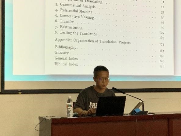 首先由何正升同学通过介绍作者尤金奈达作为引入,指出由序言部分到第八章各个章节的关键思想,带大家梳理了一遍书本。然后由赵东煊同学运用例子分析,更深层次地解释如何运用尤金奈达理论进行句子的分析、转换、重组和检验,让大家更好地理解这个理论。