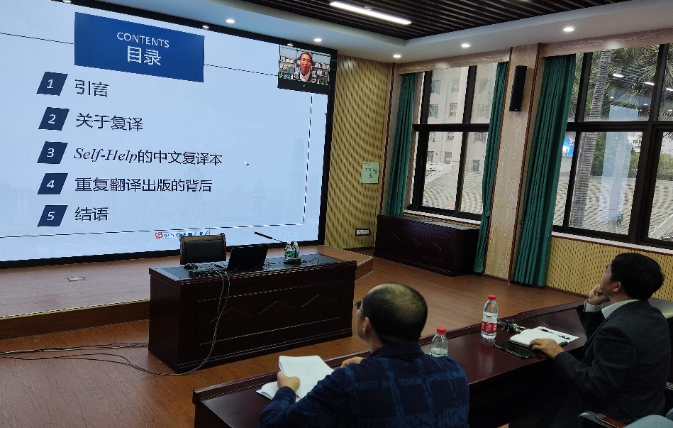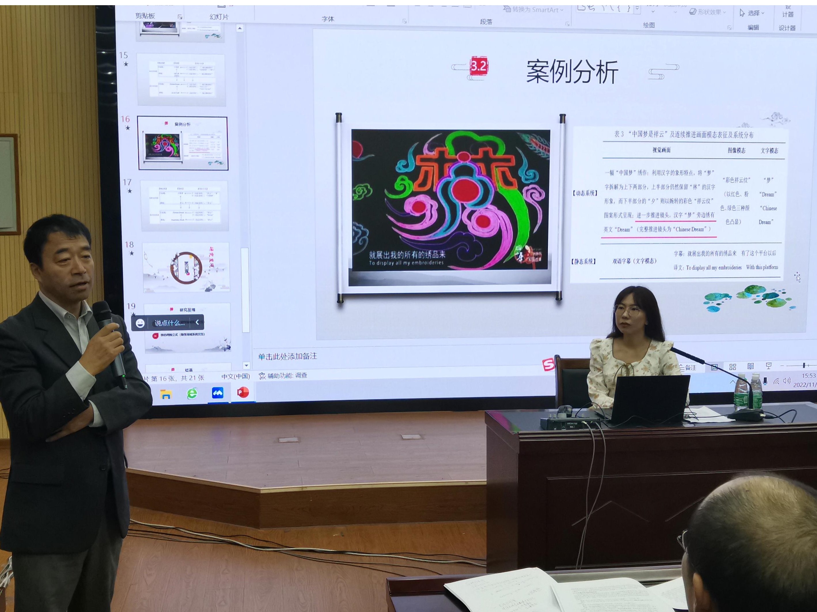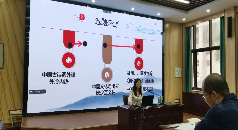 汪贝同学就广西民族文化宣传片中的多模态隐喻翻译提出了自己独到的见解,植根于广西本土民族文化进行选题,通过自身建立的文化语料库对宣传片中的各种文化象征进行了归纳,总结了其中采用的“多模态交互式”和“模态间独立式”的两种翻译策略。因疫情原因,覃恋同学无法来到现场,但也通过线上报告的形式给大家带来了一场精彩的学术报告。她的报告聚焦于名著复译的乱象之上,通过大量的数据搜集指出了一些名著翻译工作的问题,论据充足,观点敏锐,论题颇具现实意义。