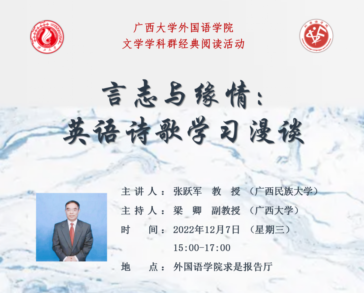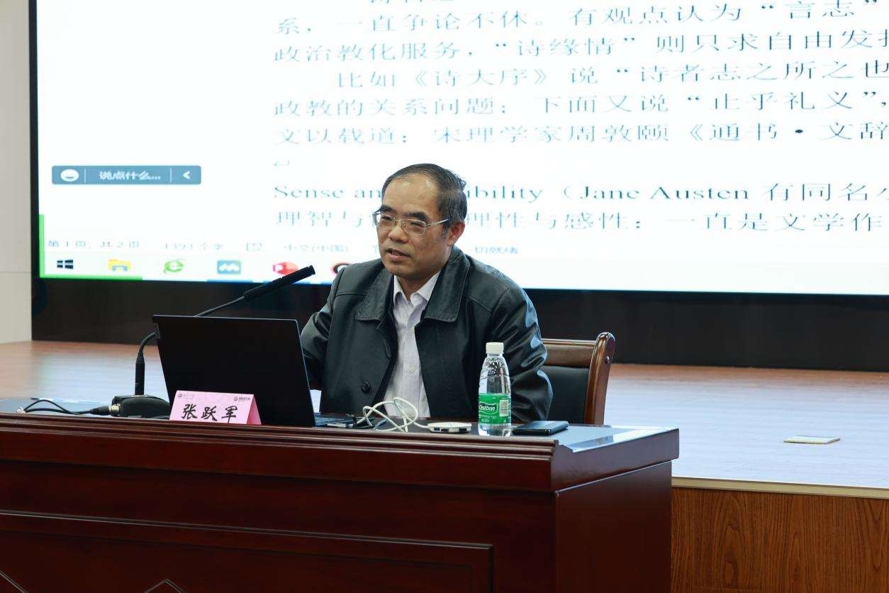 12月7日下午,太阳成集团tyc122cc文学学科群经典阅读活动“言志与缘情:英语诗歌学习漫谈”于太阳成集团tyc122cc求是报告厅顺利举行。此次经典阅读活动由张跃军教授主讲,梁卿副教授主持,吸引了公司众多师生到场交流学习。