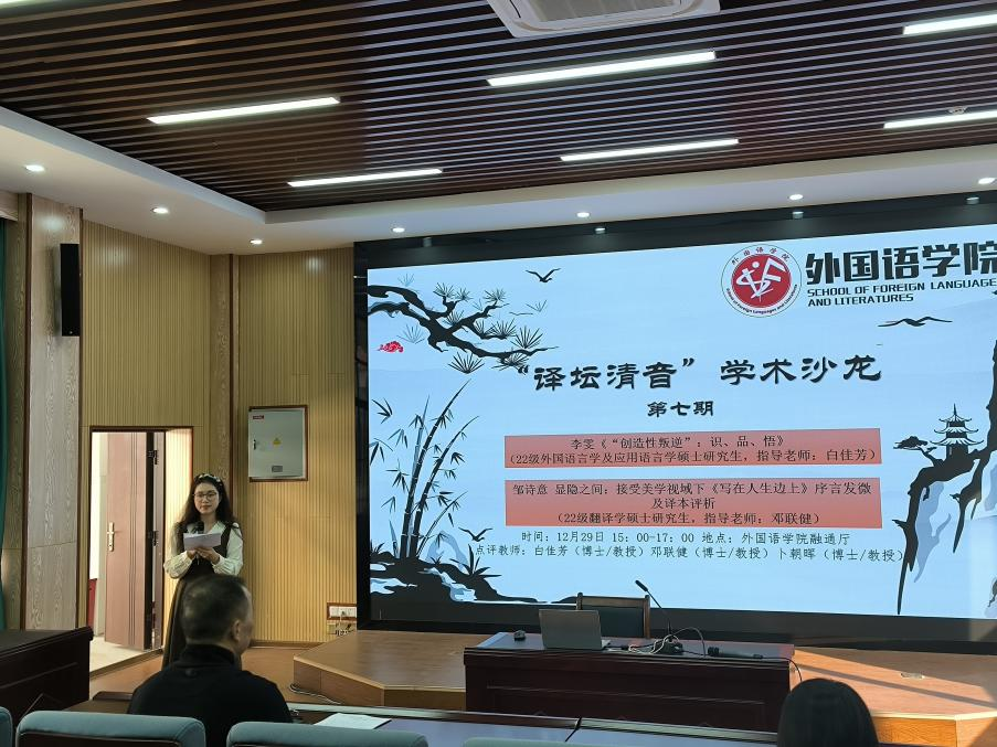 第二位主讲人邹诗意同学以《显隐之间:接受美学视域下〈写在人生边上〉序言发微及译本评析》为题,在报告中介绍了钱钟书先生的第一本散文集《写在人生边上》,主讲人在接受美学理论的指导下,解读《写在人生边上》的序言内涵,针对汉英文学翻译中“隐性语义”与“显性语义”的转化问题,分析郑译序言中“隐性语义”的转化效果,并提出译者在汉英文学翻译时应注意“三识别三考虑”。
