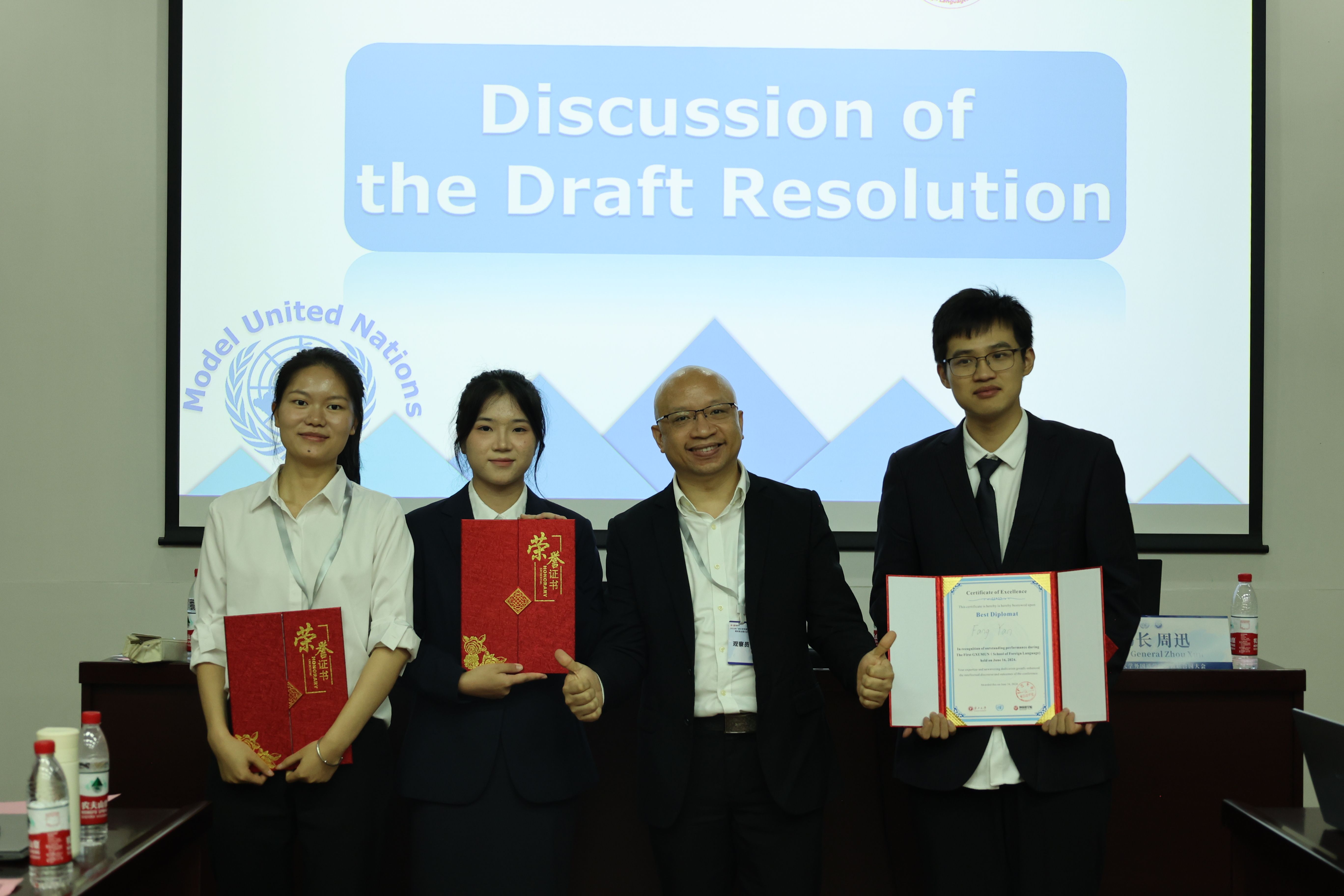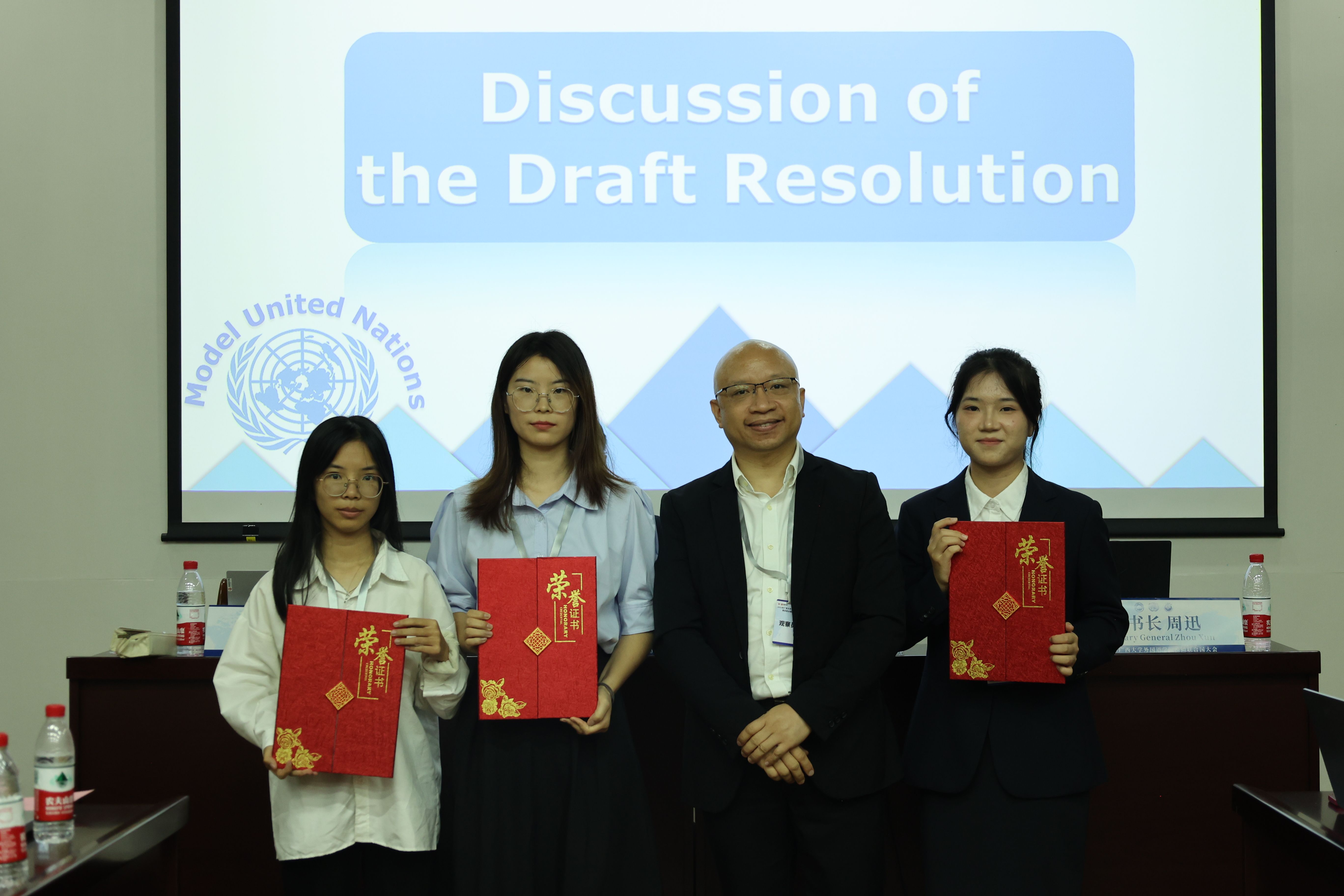 韦乔钟老师(右二)为最佳外交官颁奖,从左至右依次为:23外国语言文学班易明霞(美国代表团)、英语232班梁艺林(中国代表团)、电气工程公司方琰(法国代表团)