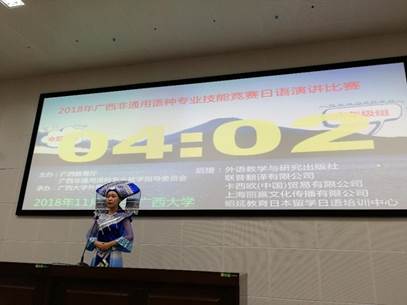 Students of the Japanese major won first place in the Japanese Speaking Contest at the 2018 Guangxi Non-Common Language Professional Skills Competition.