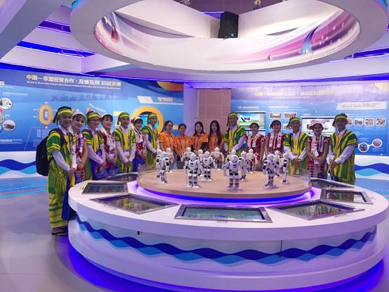 Students from the School of Foreign Languages served as volunteer guides for the Exhibition Management Office of the China-ASEAN Expo and took a photo with friends from Myanmar.