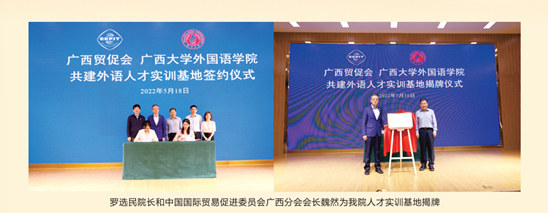 公司与中国-东盟博览事务局、广西壮族自治区外事办公室、南宁市外事办公室等15家校外单位合作联合培养人才,每年组织师生为“中国—东盟博览会”、“中国—东盟商务与投资峰会”、“中国—东盟区域合作发展论坛”、“中国—东盟产能与投资合作论坛”、“泛北部湾经济合作论坛”等国际会议、国际商贸洽谈、国际文体活动提供同声传译、交替传译、专业笔译等各种外语翻译服务和志愿者服务,通过政产学研协同育人的形式培养掌握扎实外语技能、服务区域社会经济发展的外语专业高层次人才,在中国—东盟自贸区建设和北部湾经济区建设中发挥重要作用。