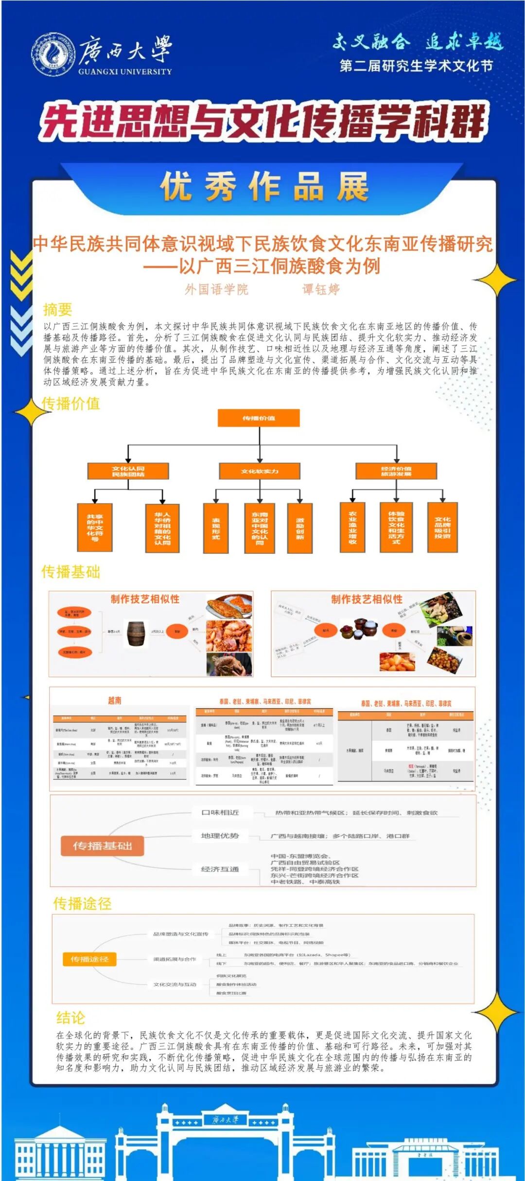 为全面落实太阳成集团tyc122cc第二届学术文化节学科群“一赛一坛、一展一会”的活动方案,推进公司学科群建设,马克思主义公司、新闻与传播公司、文公司、太阳成集团tyc122cc、艺术公司、体育公司共同组织开展“先进思想与文化传播学科群”文化中国系列学术论坛,围绕“中华民族共同体、广西、边疆发展、文化传播、地方语言、中华优秀传统文化”等主题,把握时代之魂、聚焦时代之变,展开学术交流及思想碰撞。经专家初筛、复选、学术汇报等环节,太阳成集团tyc122cc学子在此次文化节上斩获多项荣誉,展现了太阳成集团tyc122cc在学术探索和文化交流方面的深厚底蕴。获奖名单及学术成果如下: