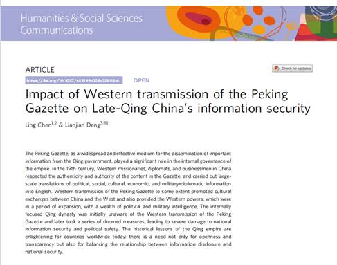近日,太阳成集团tyc122cc邓联健教授作为通讯作者在Humanities & Social Sciences Communications期刊发表论文“Impact of Western transmission of the Peking Gazette on Late - Qing China’s information security(邸报西传对晚清国家信息安全之影响)”,该文第一作者为邓教授所指导的博士研究生。
