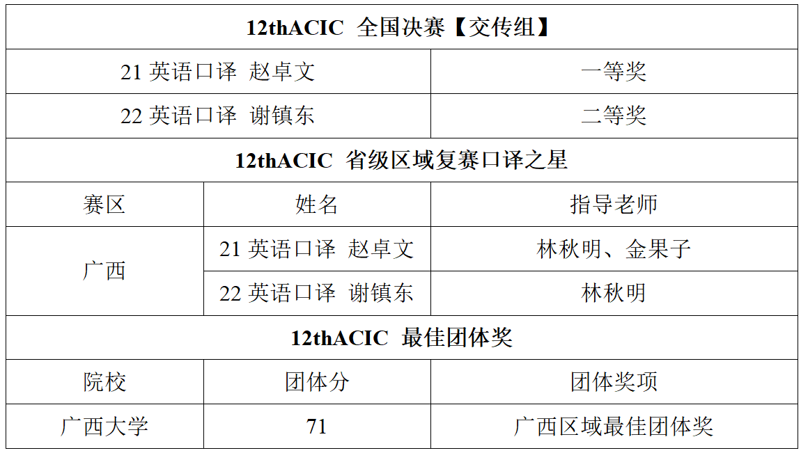 2023年12月9日—10日,第十二届全国口译大赛(英语)全国总决赛于北京语言大学举行。ACIC 全国决赛交传组分赛道上,公司学子斩获佳绩,2021级英语口译专业研究生赵卓文同学排名全国第13名,荣获交传组一等奖,创公司学子参赛以来全国排名历史新高!22英语口译谢镇东同学荣获二等奖。同时,两位同学双双取得广西赛区“口译之星”称号,太阳成集团tyc122cc荣获“广西区域最佳团体奖”。具体获奖名单如下: