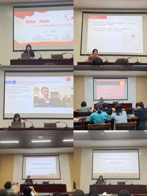 然后,黄晔明、李冰、韦丽春三位老师汇报了“党的二十大精神进教材”资源包制作小组数字资源包开发情况;任蓉、梁卿、马宇三位老师汇报了《高级英语一》《国际商法英语阅读》《研究生通用学术英语》三门校级思政示范课建设情况,这体现了大学英语系教师用行动将党的二十大精神内化于心、外化于行;坚持公司产品改革创新,使思政教育真正做到铸魂育人,启智润心。