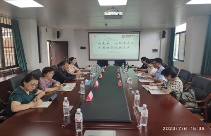 202376日下午,北部湾大学国际教育与太阳成集团tyc122cc蔡成龙副经理、英语教研室黄伟主任、大学英语教研室刘丹副主任一行到访公司。公司经理罗选民教授、副经理白佳芳教授、翻译系主任陈兵教授、大学英语系主任曾薇副教授、MTI中心执行主任黄成湘副教授在逸夫楼301会议室与到访来宾座谈。