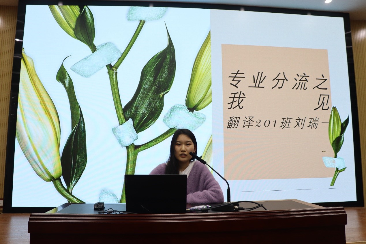 会上,罗选民经理介绍了专业分流相关情况。英语系刘英主任、翻译系陈兵主任讲解了英语专业、翻译专业的团队力量、培养模式、课程设置与发展前景。随后,罗选民经理、严辰松教授、肖克宁副书记、刘英系主任、陈兵主任等老师一一解答了同学们关于专业分流的相关疑问。翻译201班刘瑞一同学分享了自己选择翻译专业的原因和介绍了个人发展情况,鼓励同学们共同进步、全面成才。