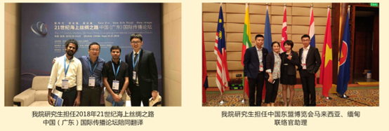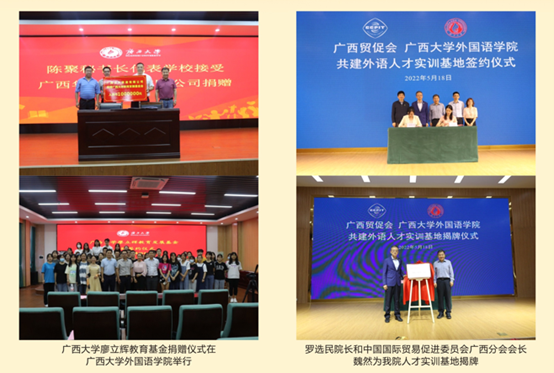 公司与广西壮族自治区外事办、中国-东盟事务博览局、南宁市外事办、钦州市外事办等校外单位合作联合培养人才,派出大量研究生志愿者、实习生服务中国-东盟博览会、中国-东盟商务与投资峰会、泛北部湾经济论坛、中国矿业论坛、国际半程马拉松、苏迪曼杯羽毛球世界锦标赛、国际医学创新合作论坛中国-上海合作组织、中国企业跨国投资研讨会、中国-东盟社会发展与减贫论坛等重大外事活动,通过校外实习协同育人的形式培养掌握扎实英语技能、服务地方经济建设的外语专业人才。