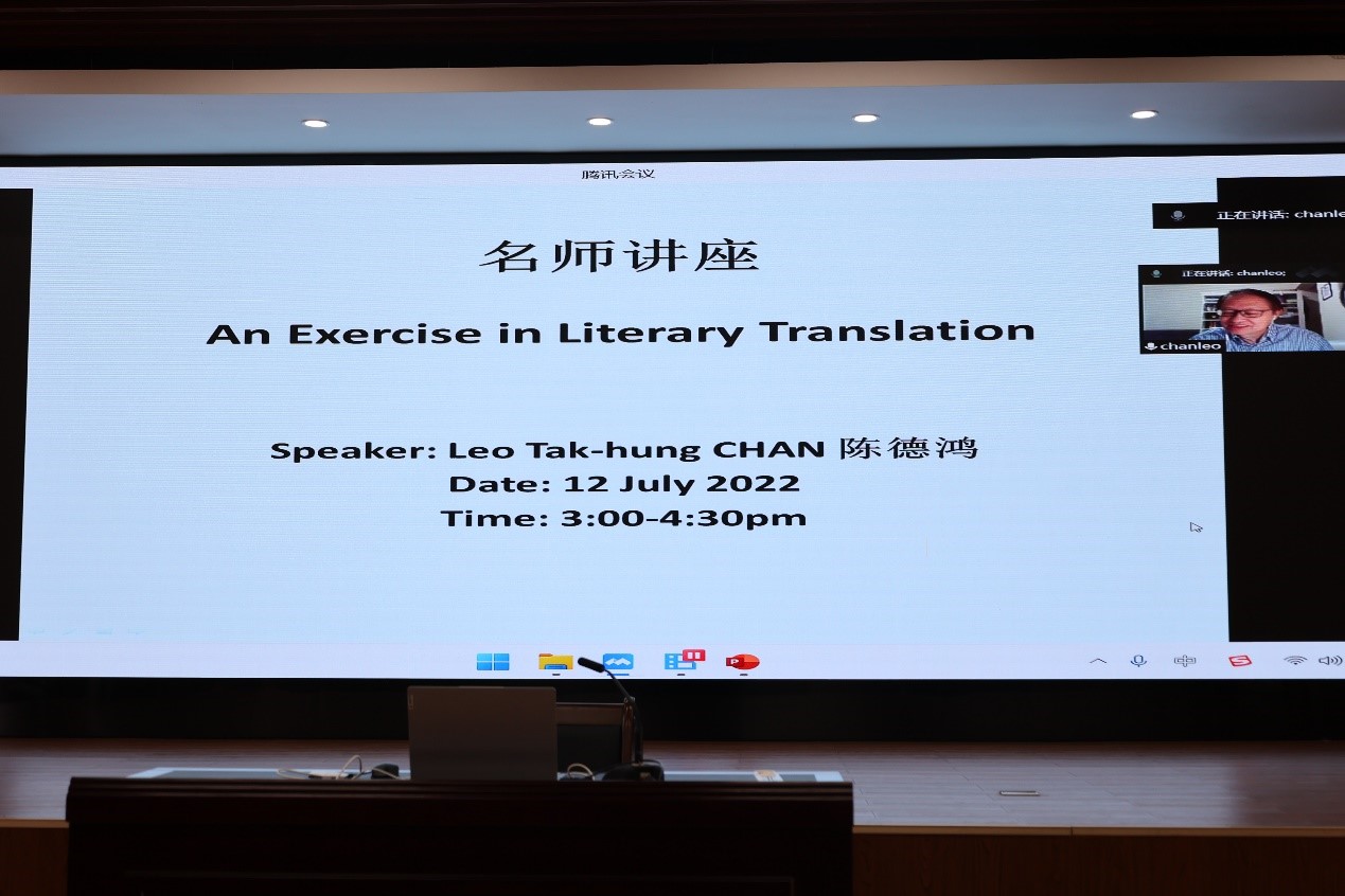 在经过短暂的休息后,第二场名师讲座由太阳成集团tyc122cc君武特聘教授、香港浸会大学陈德鸿教授开讲,主题为“An Exercise on Literary Translation”,由胡戈副教授主持。本场讲座以线上方式进行,陈德鸿教授以细致入微的文本分析,为大家带来了精彩的文学翻译实践案例解析。他指出,文学翻译领域内中译英的关键是把握时态的选择。中译英的一个关键问题是时态问题,只有把握好英语动词的时态才能翻译好文学文本。此外,陈德鸿教授提醒广大在场师生和营员注意区分英文对话与中文对话的分段,由此才能更好的把握文学作品的中译英实践。讲座的最后,陈德鸿教授鼓励大家阅读经典,提升自我的修养境界,为今后的学习与工作打下坚实的基础。