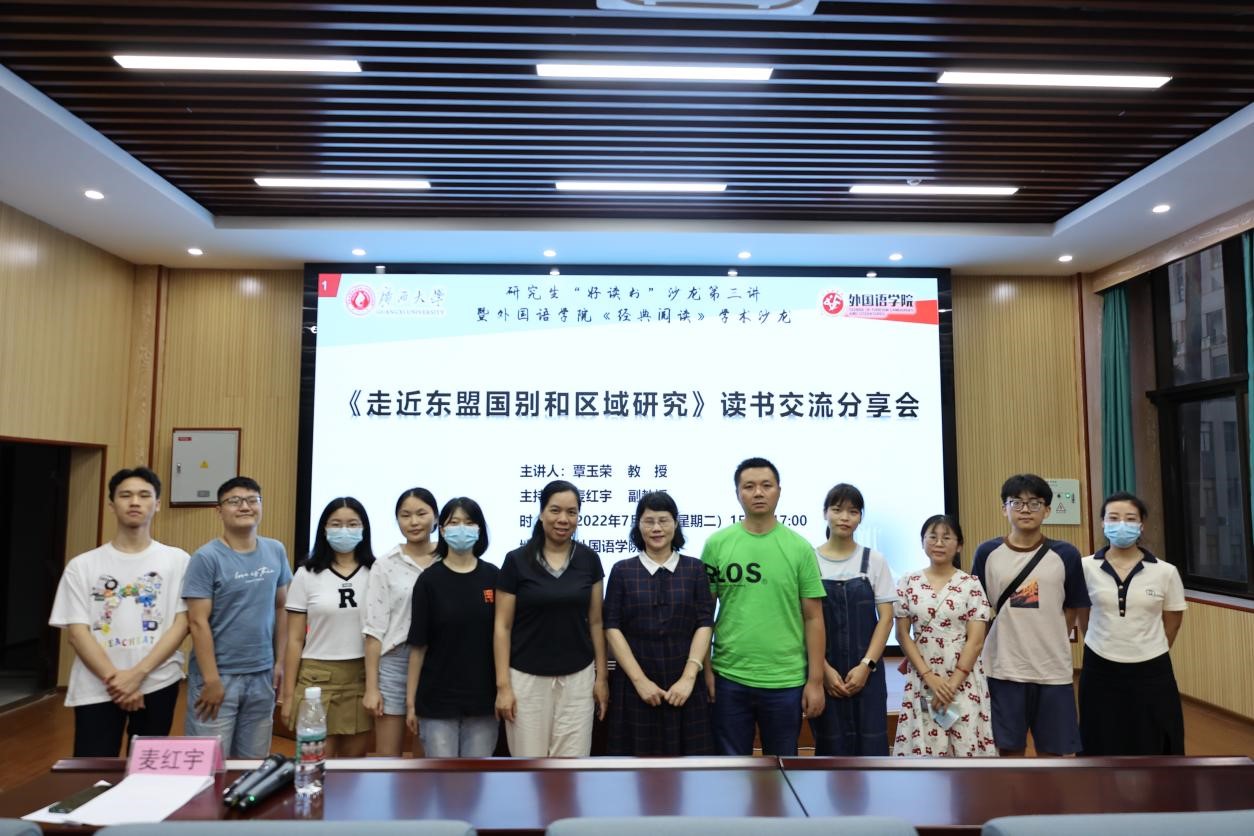 7月5日下午,研究生“好读书”沙龙第三讲暨太阳成集团tyc122cc“经典阅读”学术沙龙之“走近东盟国别和区域研究”读书交流分享会于太阳成集团tyc122cc融通厅顺利举行。此次读书分享会由硕士生导师覃玉荣教授主讲,麦红宇老师主持,公司众多师生到场交流学习。