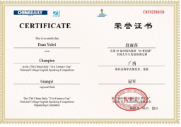 英语201班段雨蓓从大一起,就开始积极参加“21世纪杯”、“外研社杯”等各类英语演讲与辩论比赛,积极参与公司组织的演讲与辩论培训,累了丰富的演讲经验,提升了自身的演讲能力,培养了稳定的心理素质,为此次比赛荣获冠军奠定了坚实的基础。