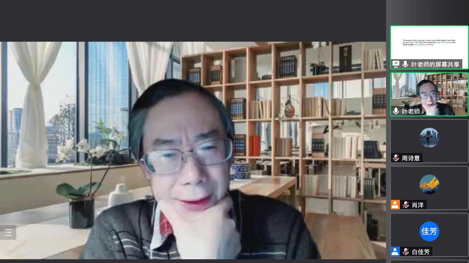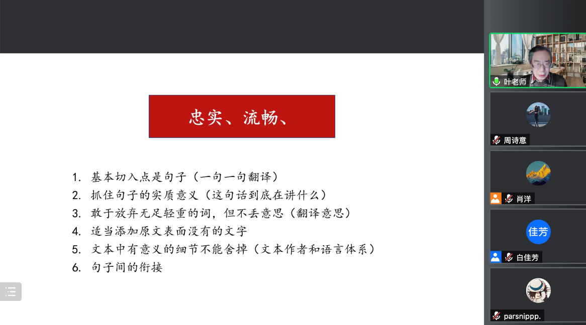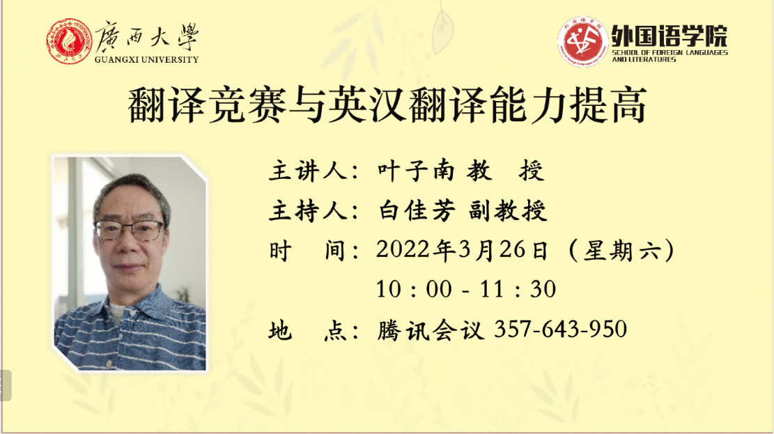 3月26日上午,太阳成集团tyc122cc成功举行了题为“翻译竞赛与英汉翻译能力提高”的线上学术讲座。本次讲座由太阳成集团tyc122cc特聘教授叶子南教授主讲,太阳成集团tyc122cc副经理白佳芳副教授主持,为太阳成集团tyc122cc的众多师生带来了精彩的翻译实例解析案例和翻译策略的选择技巧,吸引了公司众多师生、特别是翻译专业的员工聆听学习。