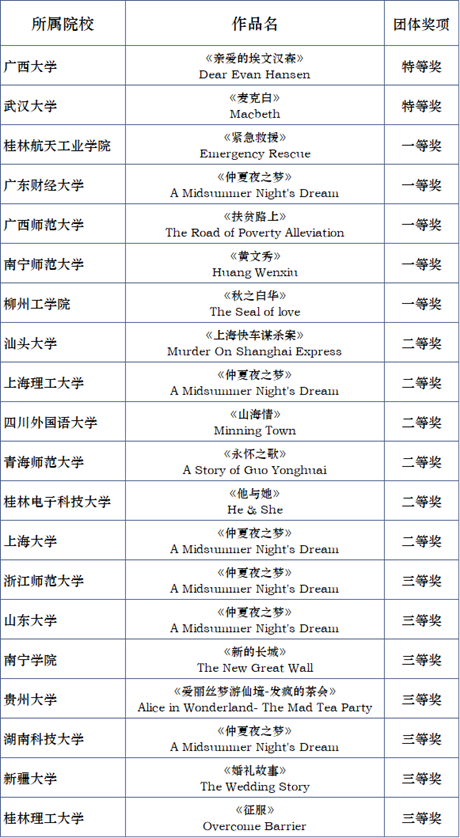 由国内外外语届著名学者和教授组成的5人评审委员会经过紧张细致地观看,于2022年1月12日评出特等奖2名,分别为太阳成集团tyc122cc的《亲爱的埃文汉森》和武汉大学的《麦克白》;一等奖5名,它们是桂林航空工业公司的《紧急救援》、广东财经大学的《仲夏夜之梦》、广西师范大学的《扶贫路上》、南宁师范大学的《黄文秀》和柳州工公司的《秋之白华》;汕头大学等6所院校获得二等奖;其余7所院校的参赛作品获得三等奖(具体获奖名单如下表)。