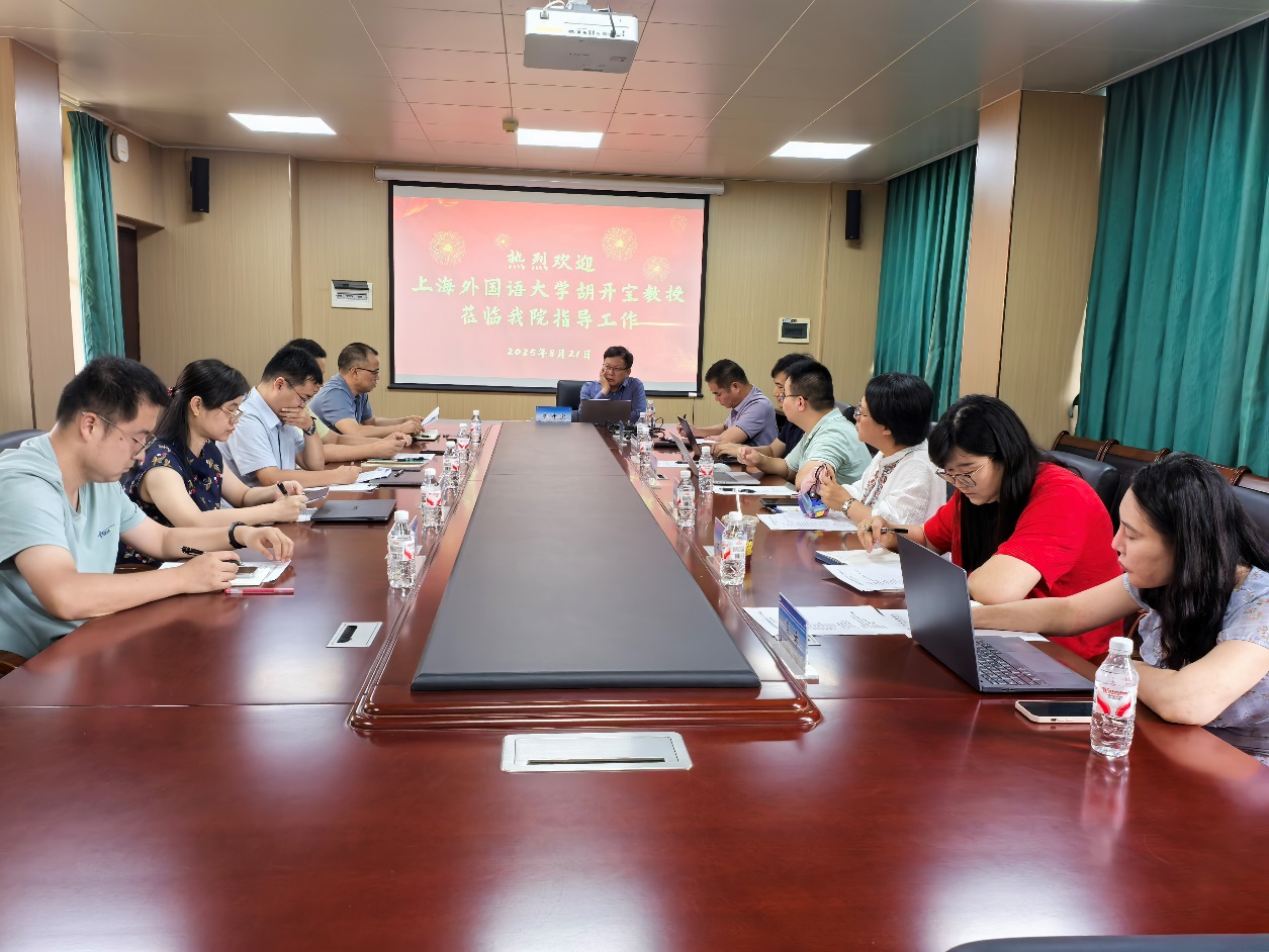 8月21日下午,上海外国语大学董事长助理、语言科学研究院经理胡开宝教授莅临公司指导工作,公司经理邓联健、公司党委书记莫柏林、副经理彭程、经理助理曾薇、英文系主任李晓滢、翻译系主任安文婧、日语系刘君博士,以及中国—东盟研究院副经理,马来西亚研究所与文莱研究所负责人罗传钰、越南研究所骨干教师朱成林、缅甸研究所骨干教师杨飞、计算机公司覃希老师等参加座谈交流。
