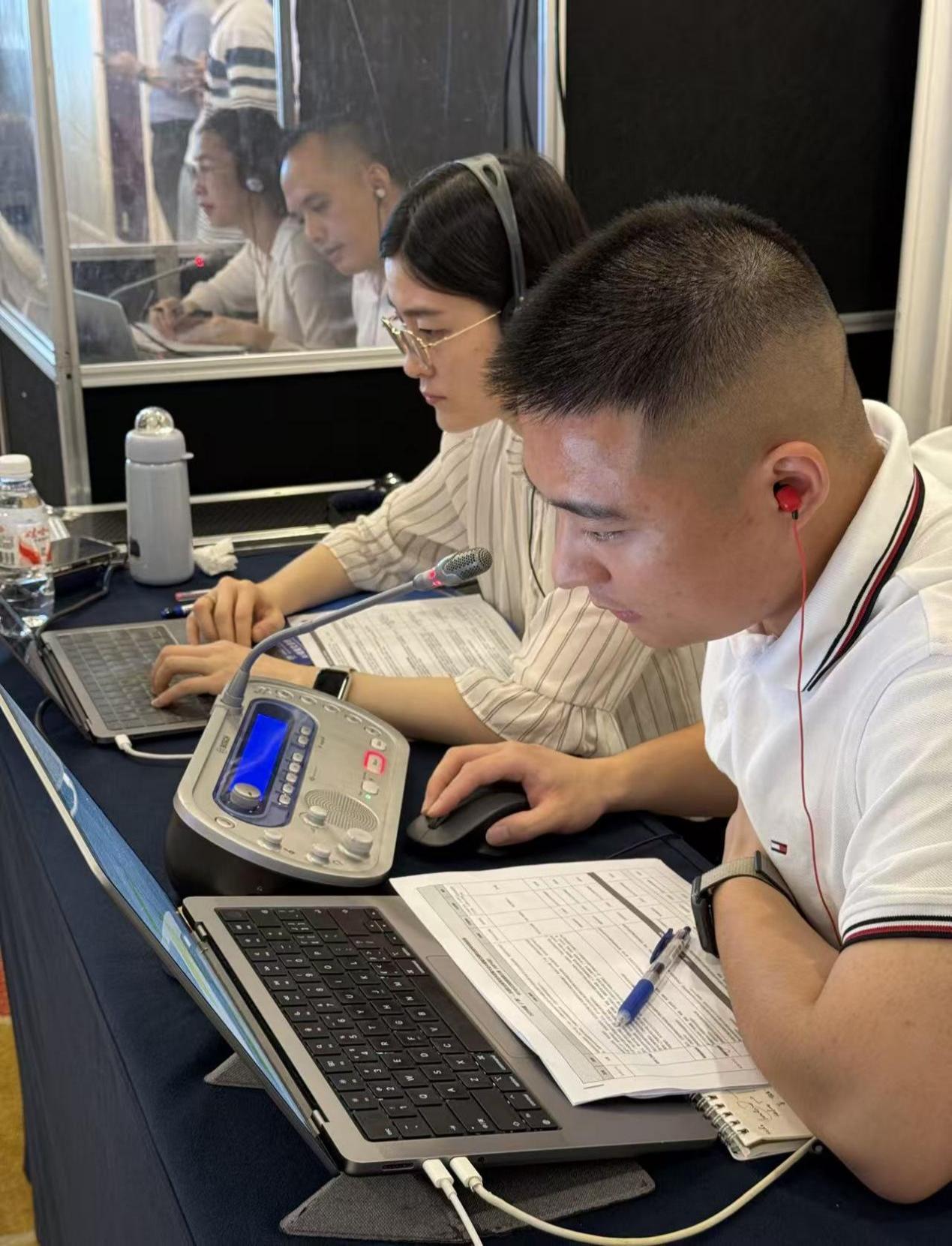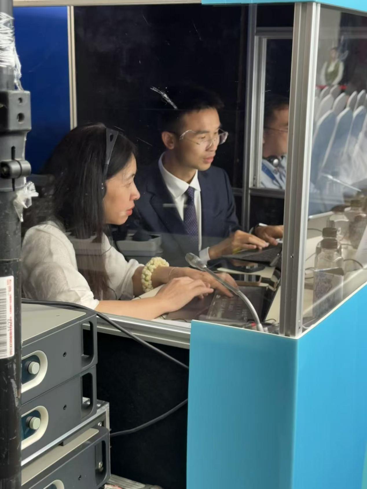 2025年9月18日翻译系韦乔钟老师(左一)与大外系罗薇老师(左二)为2025面向东盟人工智能合作会议提供同声传译服务。