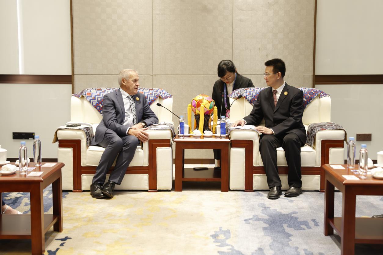 2025年9月17日翻译系安文婧老师(右二)为广西壮族自治区政府副主席胡帆会见新西兰前议长、新中友好协会名誉主席戴维·卡特提供交替传译服务。