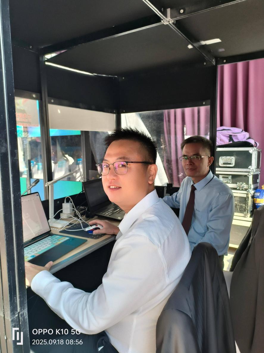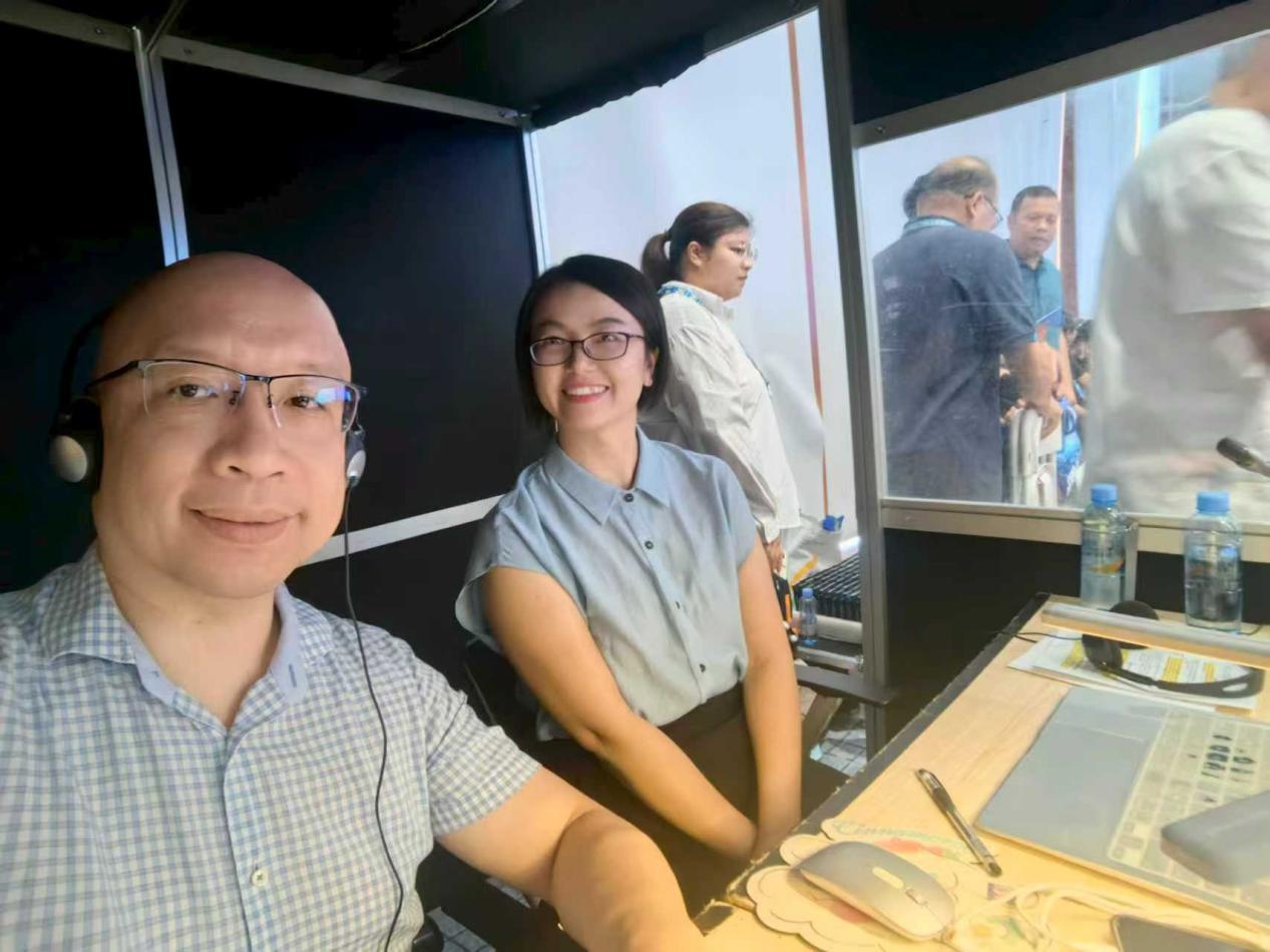 2025年9月17日翻译系林秋明老师(右一)与公司MTI口译2014届毕业生曲涛(左一)为2025广西国际友城推介交流活动提供同声传译服务。