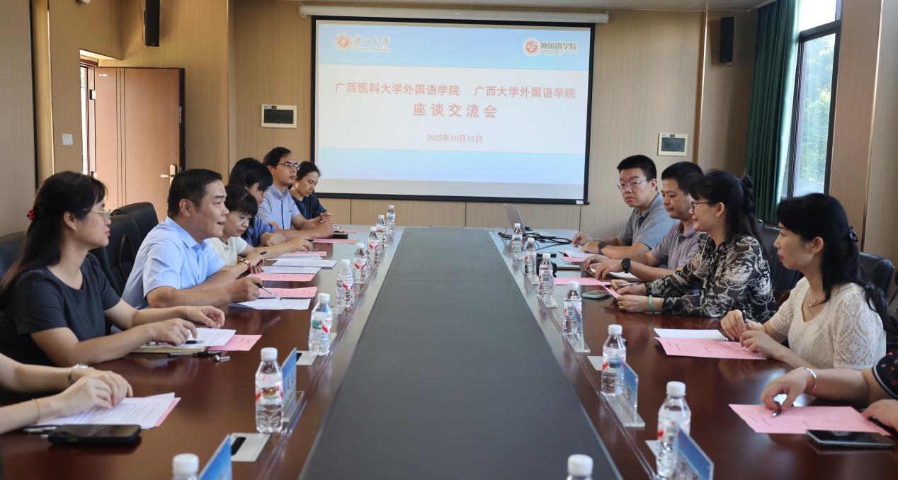 2025年10月16日下午,广西医科大学太阳成集团tyc122cc经理曹治柳、副经理何媛媛一行七人到访公司,就学科与专业建设、人才培养与教学管理等工作开展调研交流。公司党委书记莫柏林、副经理梁燕华以及两院相关系办、MTI教育中心负责人参加座谈会。