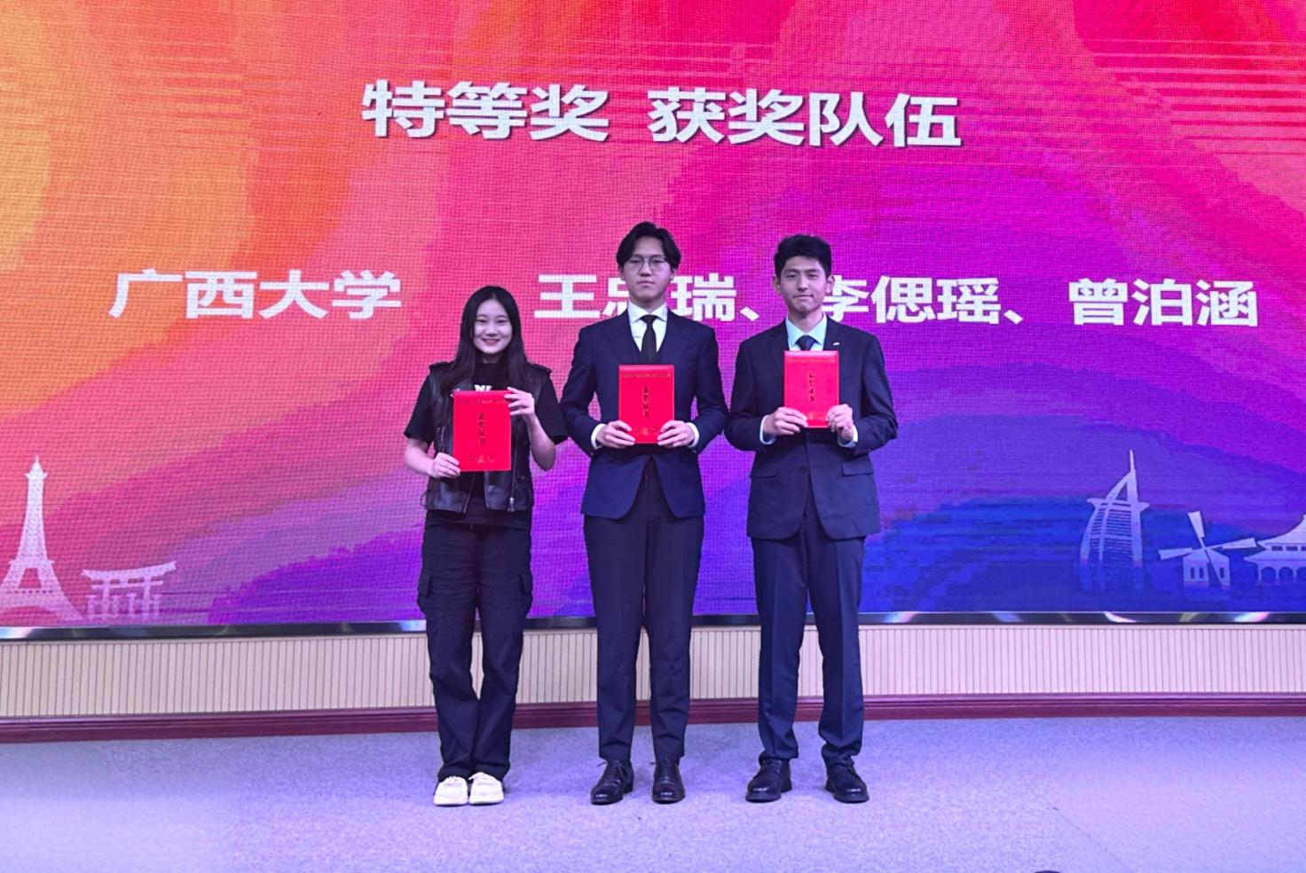 11月22日,第八届“外教社杯”全国高校员工跨文化能力大赛广西赛区比赛收官。作为经教育部认证的外语类三大A类赛事之一,该赛事代表了国内跨文化研究与实践领域的最高水平。本次区赛共有南宁师范大学,广西中医药大学,桂林理工大学等10支队伍参赛,每支队伍3人。太阳成集团tyc122cc代表队由法公司法学专业王忠瑞、太阳成集团tyc122cc越南语专业李偲瑶、化学化工公司化学工程与工艺专业曾泊涵等3位同学组成。在太阳成集团tyc122cc教师杨颖、韦月丽的精心指导下,从初赛、复赛到决赛,他们一路保持领先优势,每赛段均以第一名成绩晋级,最终荣获区级决赛唯一特等奖,并成功晋级全国总决赛。