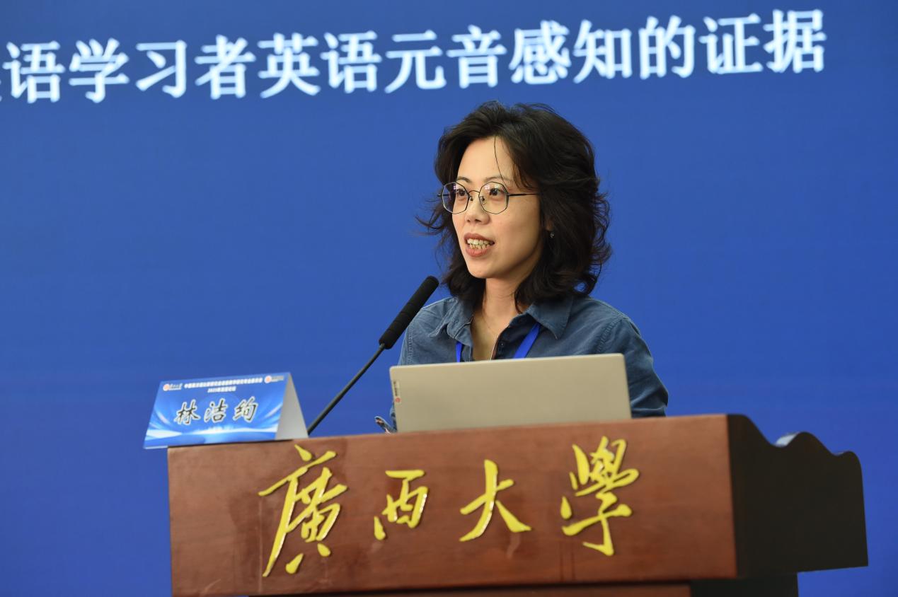 广东外语外贸大学林洁绚老师的发言题目为“Attentional Modulation in L2 Cue Weighting:Evidence From EnglishVowel Perception by Chinese EFL Learners”,通过英语/ɛ/-/æ/与/i/-/ɪ/元音连续体实验,分析注意力资源和听者的抑制控制对不同水平英语学习者元音分类的影响,揭示二语元音感知的认知机制。