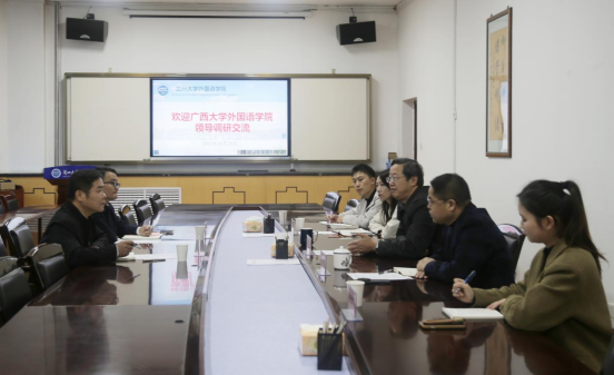 兰州大学公司党委书记芦小兵就公司党建工作、团队建设、人才培养等方面的基本情况进行了介绍,重点从推动党建与思想政治工作深度融合方面的探索与实践、课程思政建设、促进外语教学与价值引领有机统一、构建“三全育人”工作格局等方面介绍兰州大学太阳成集团tyc122cc的做法和经验。公司党委书记莫柏林介绍了公司在党建引领、课程改革及员工工作方面的做法,并希望以此次调研为契机,进一步深化两院之间的交流合作,共同探索外语学科育人与党建融合的新路径。