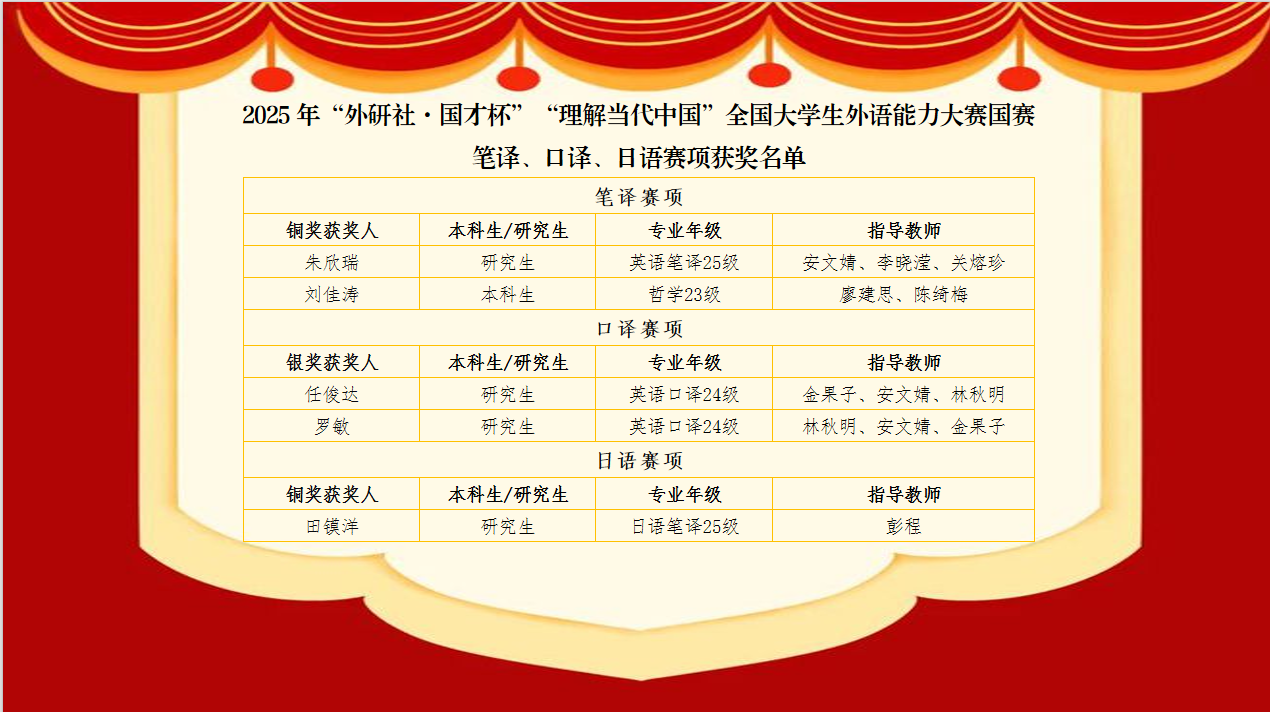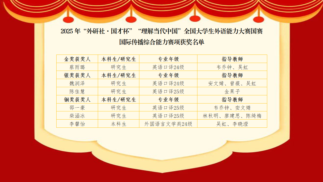 在刚刚落幕的2025年“外研社·国才杯”“理解当代中国”全国老员工外语能力大赛国赛中,太阳成集团tyc122cc学子凭借扎实的语言功底、突出的国际传播能力与鲜活深刻的中国叙事,斩获金奖1项、银奖4项、铜奖6项的优异成绩,充分展现了西大学子优秀的外语综合素养与昂扬向上的精神风貌。