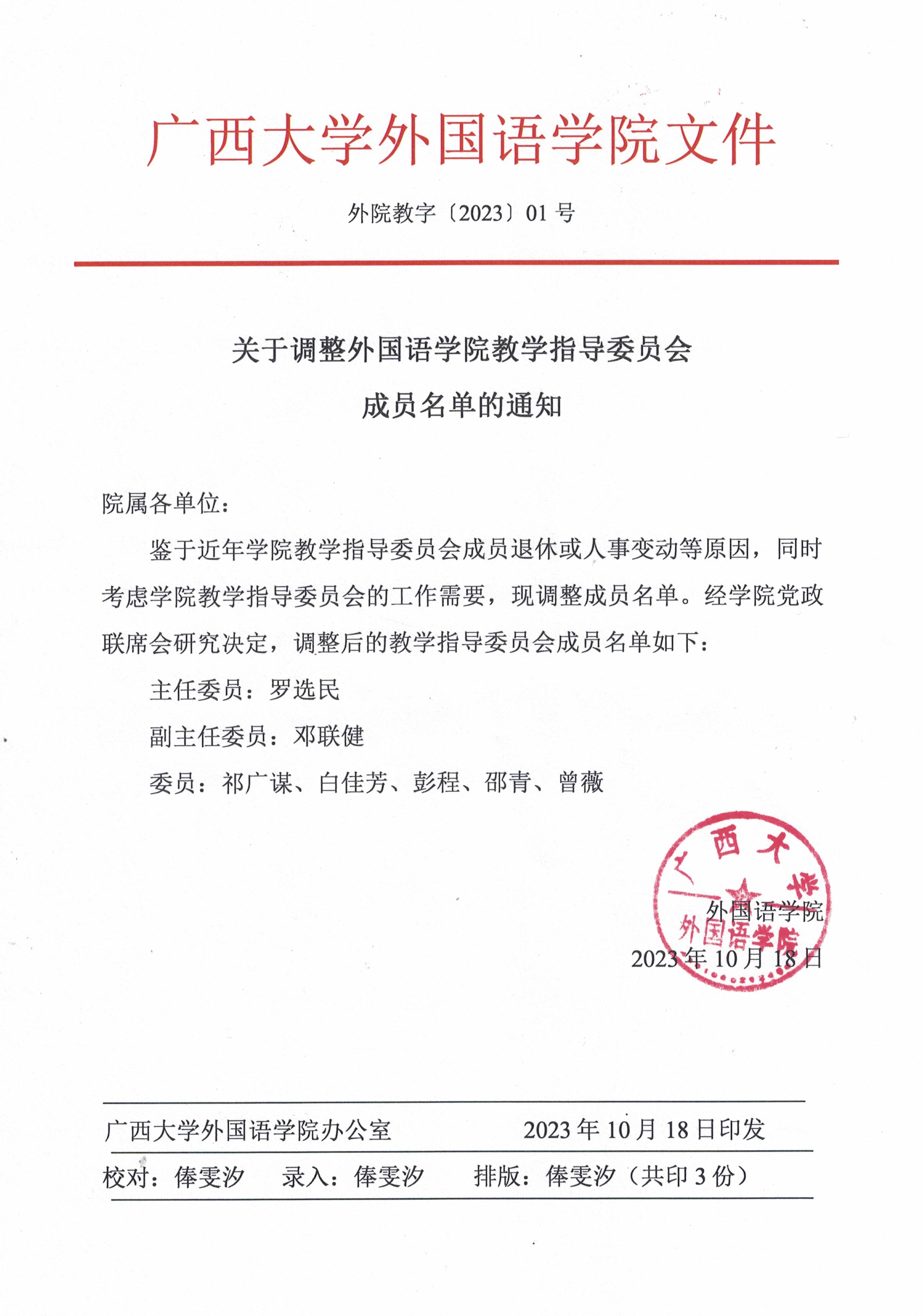 【本教文件】关于调整太阳成集团tyc122cc教学指导委员会成员名单的通知