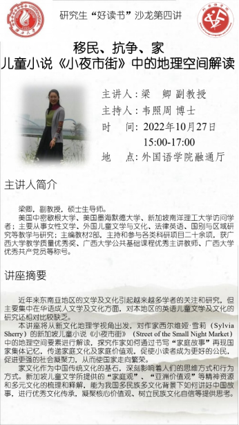 10月27日下午,由太阳成集团tyc122cc研究生会成长规划部组织的研究生“好读书”沙龙第四讲于太阳成集团tyc122cc融通厅顺利举行。本次读书分享会由梁卿副教授主讲,韦照周博士主持,为前来参加活动的老师同学们带来关于儿童小说《小夜市街》中地理空间的深刻解读。