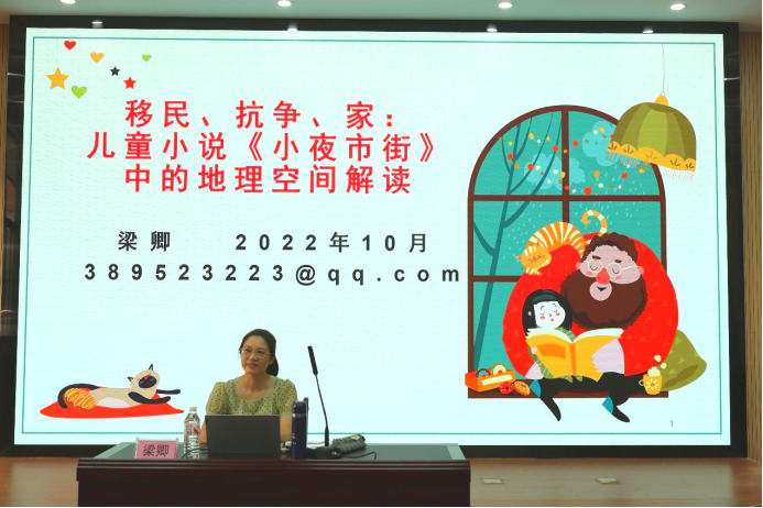 讲座开场,梁卿副教授解释了小说主题小夜市街的概念。随后,梁卿副教授简要阐述了采用新文化地理学视角分析《小夜市街》的原因。她指出,地域小说已成为地理学家了解地域特征和人性的一种手段,具有重要意义,但东南亚的地域文学中家庭文化类研究还相较缺乏。她提出了几个探析小说中新加坡地理空间的关键性问题,通过对比“新”“旧”文化地理学区别,将地理空间与儿童文学的联系向同学们娓娓道来。梁卿副教授总结到,地名承载着丰厚的历史底蕴、独特的自然人文景观,通过了解本土化故事,我们能认识当地的风景、习俗、传统和价值观。同时,儿童小说这种对过去的回忆和再创造是一种怀旧感的象征,也是一种教育孩子了解过去的愿望。