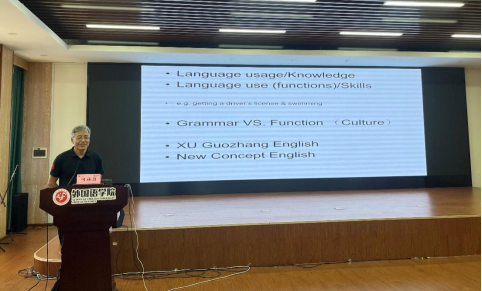何教授用一个鲜活的例子开始了讲座,引人入胜。作为国际通用语言,英语的语言功能和文化因素在交际技能方面理应受到特别的重视,但是中国英语教学由于标准化测试需求而陷入误区:注重语言知识面不够重视语言技能,即可能造成语言学习和应用过程中的有知识没文化的现象。