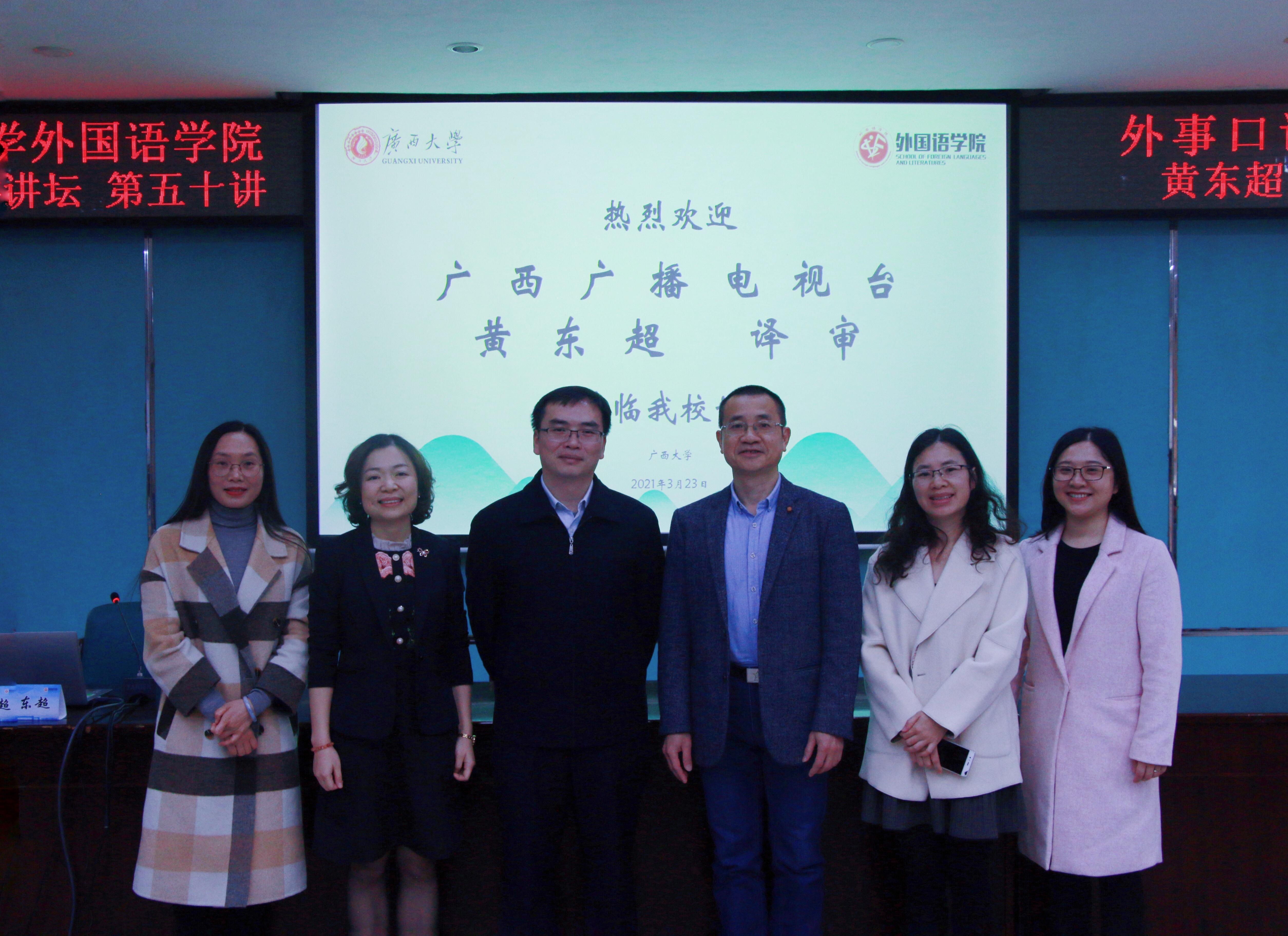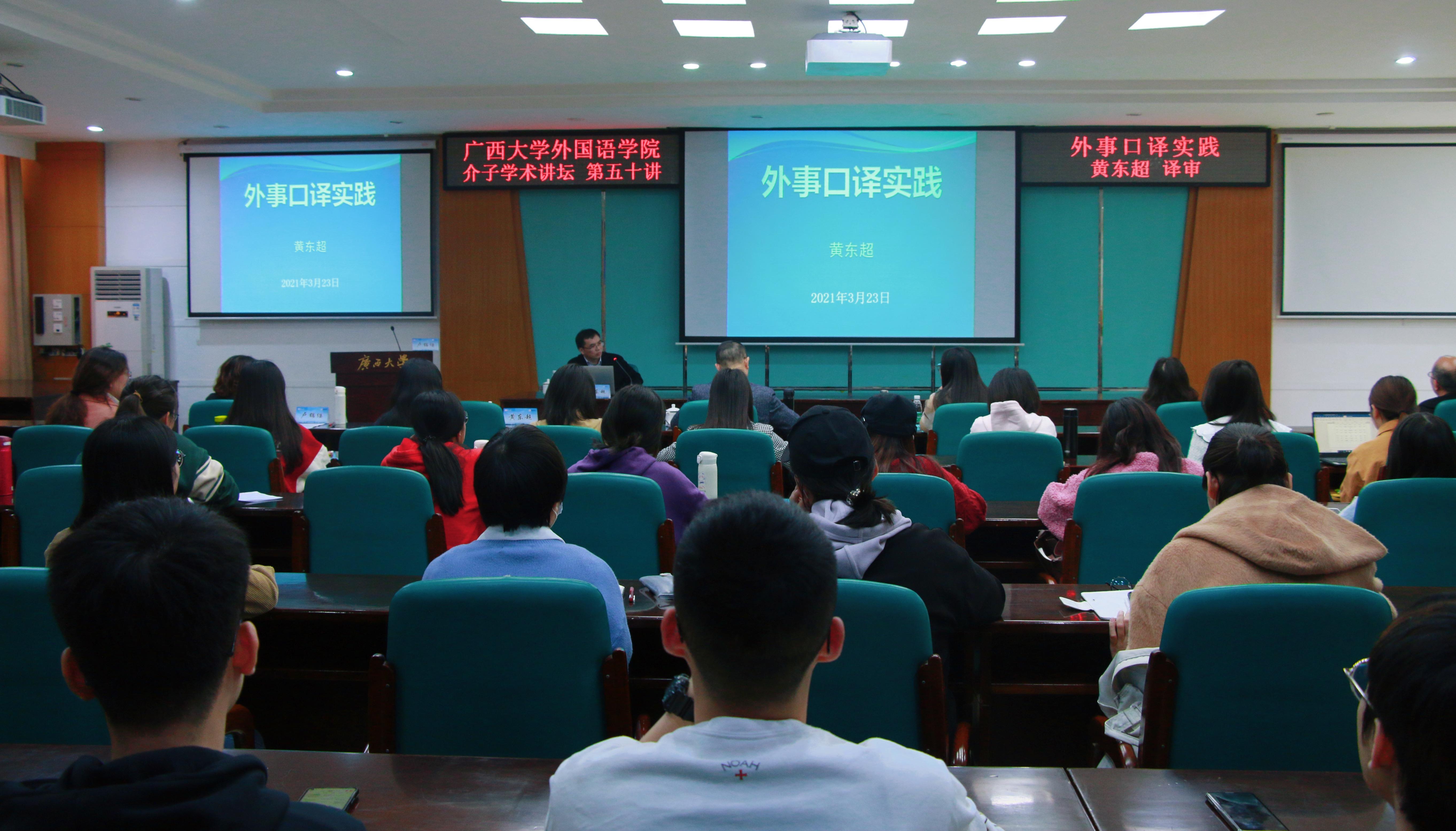 3月23日下午,太阳成集团tyc122cc介子学术论坛第五十讲在太阳成集团tyc122cc君武馆第二会议室成功举办。广西广播电视台北部湾之声监制、译审黄东超老师莅临公司,为公司越南语专业师生带来了题为《外事口译实践》的精彩讲座,讲座由公司东南亚语系副主任卢锦缨老师主持。
