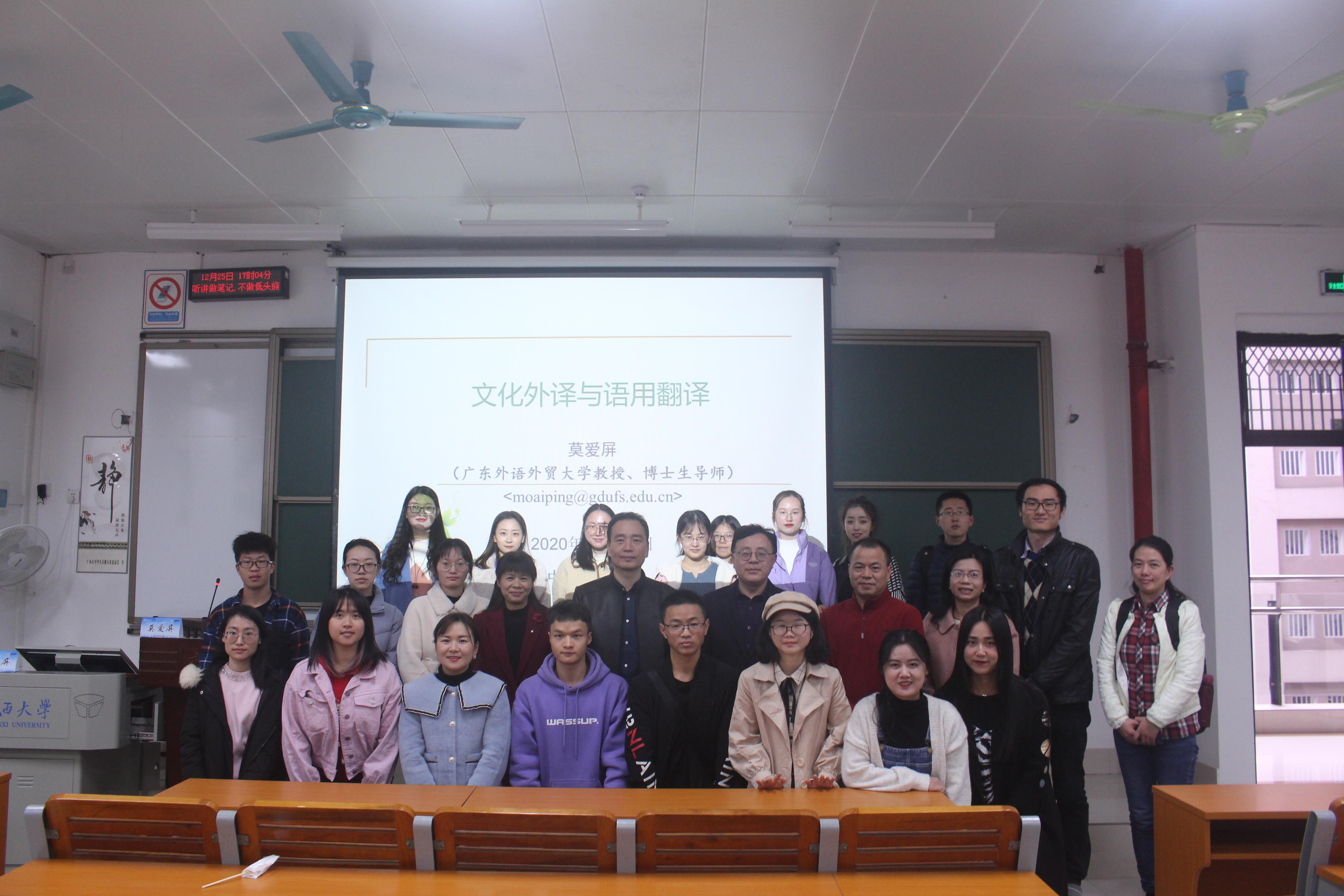 12月25日下午,太阳成集团tyc122cc介子学术讲坛第四十八讲于太阳成集团tyc122cc第六教学楼顺利举行,广东外语外贸大学国家级同声传译实验教学中心主任、博士生导师莫爱屏教授应邀为公司师生带来了题为“文化外译与语用翻译”的精彩讲座。讲座由太阳成集团tyc122cc科研副经理梁燕华教授主持。