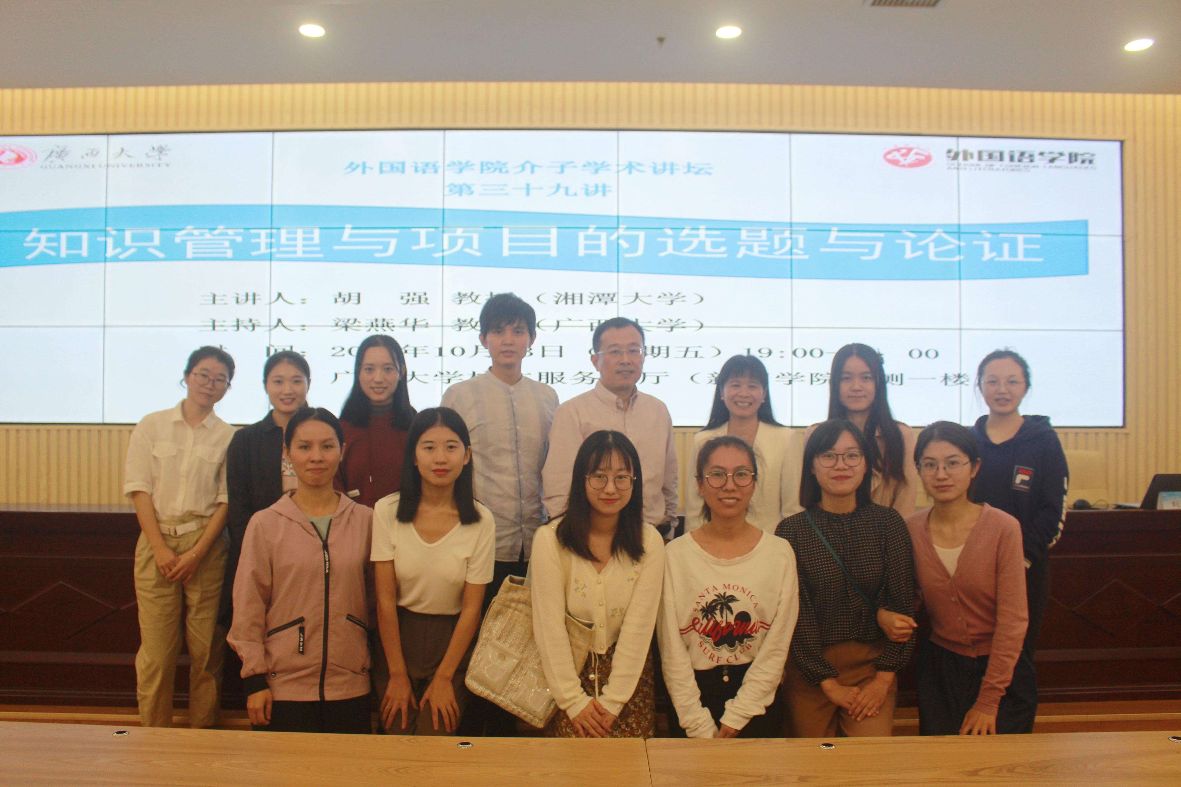 10月23日晚,太阳成集团tyc122cc介子学术讲坛第三十九讲于太阳成集团tyc122cc员工服务大厅顺利举行。湘潭大学太阳成集团tyc122cc经理、湖南省高校学科带头人、“英语”国家级一流专业建设点负责人胡强教授,应邀为公司师生带来了题为“知识管理与项目的选题与论证”的精彩讲座。本次讲座由太阳成集团tyc122cc梁燕华教授主持。