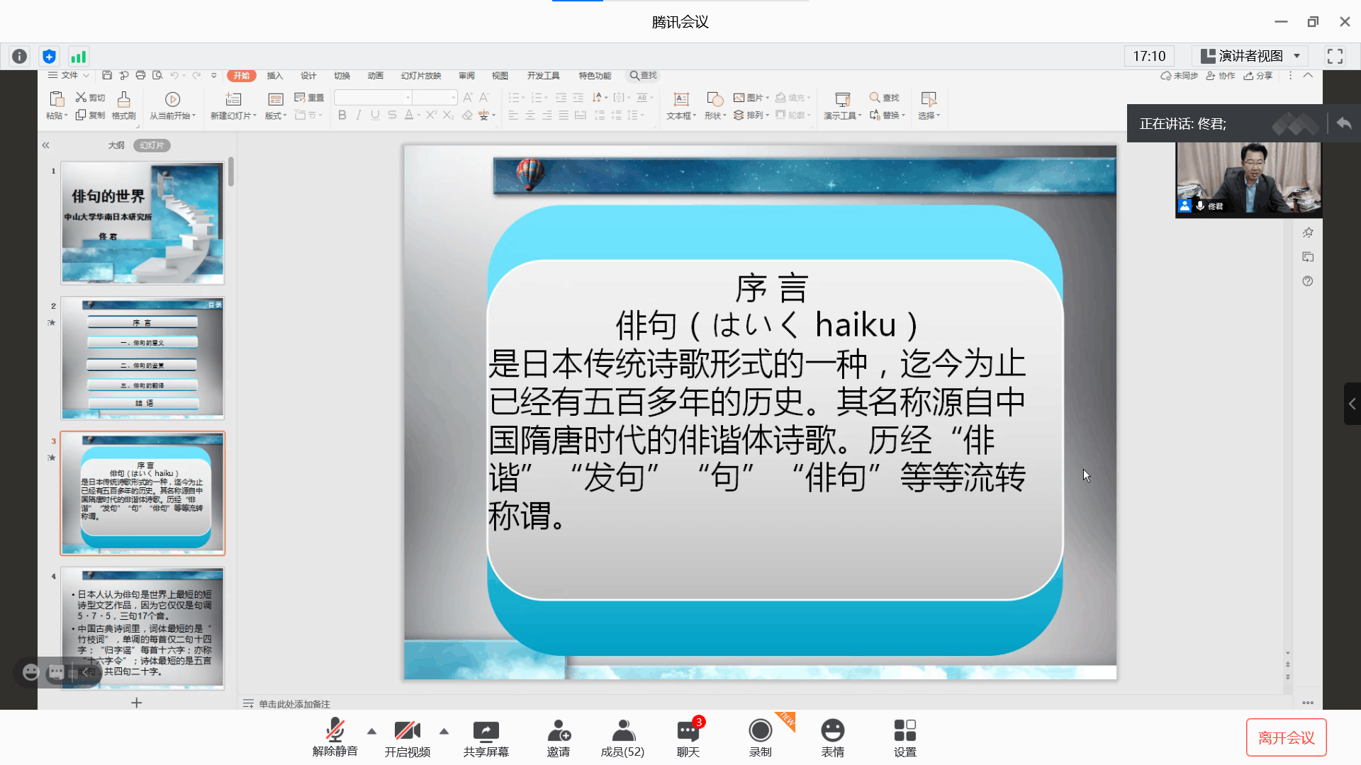 10月20日晚7点,太阳成集团tyc122cc介子学术讲坛第三十七讲通过腾讯会议在线视频圆满举行。中山大学华南日本研究所副所长,广东省本科高校外语类专业教学指导委员会亚非语言专业分委员会副主任委员,《东亚学术研究》编委佟君教授,应公司邀请,以“俳句的世界”为题,为公司师生进行了精彩的线上讲座,带大家走进日本古典诗歌的世界。本次讲座由太阳成集团tyc122cc张贵生博士主持。
