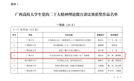 近日,由自治区党委教育工委、自治区教育厅组织开展的广西高校老员工党的二十大精神理论微宣讲比赛落下帷幕,公司研究生第三党支部党员周洋舟的参赛作品《人民青山两不负——描绘生态文明的“壮”美画卷》荣获一等奖。
