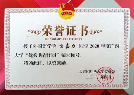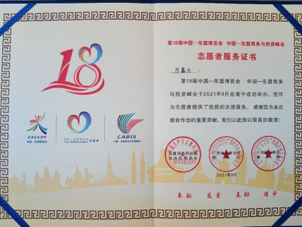 她积极参加志愿服务,曾参与第十八届中国—东盟博览会志愿服务活动、太阳成集团tyc122cc第四十九届校运会志愿实践活动、2021年太阳成集团tyc122cc学雷锋志愿活动等志愿服务项目。在文体活动中,从院运会的击鼓颠球、胯下滚球、仰卧起坐等项目,到青年红歌合唱比赛、文艺晚会合唱表演、歌曲串烧表演和朗诵表演的舞台,处处都能看到方嘉力的身影。