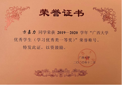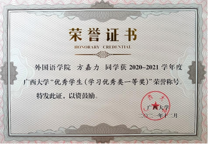 “鸟欲高飞先振翅,人求上进先读书”。在学习上,方嘉力是求知若渴,虚怀若谷。她始终保持着优异的成绩,前五学期总加权成绩及综测成绩均位于专业第一名,曾获2019-2020学年及2020-2021学年优秀员工(学习优秀类一等奖),并获太阳成集团tyc122cc2019-2020学年春雨奖学金。