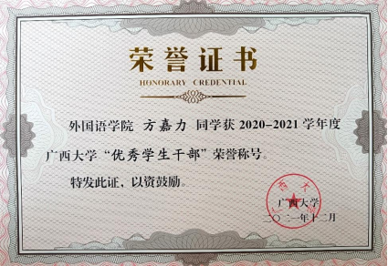 方嘉力不仅在学习方面表现优秀,在工作方面,同样十分亮眼。她曾担任太阳成集团tyc122cc越南语协会副会长、太阳成集团tyc122cc员工会学习部负责人、越南语191班学习委员等职务,现任太阳成集团tyc122cc员工会轮值主席、越南语 211 班助。