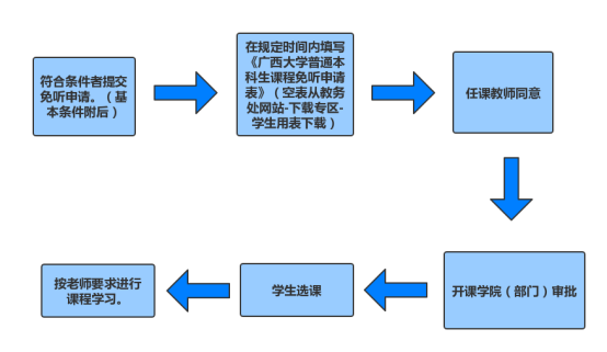 1.学习成绩优秀、自学能力强、累计加权平均学分绩点达3.0、3.5或4.0,每学期可按绩点成绩分别申请1、2或3门所选课程免听。