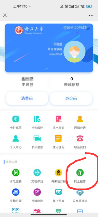 可持本人有效证件(身份证/员工证)到网络大楼一楼(计算机公司对面,绿色玻璃那一栋楼)自助补卡机办理补卡手续,补卡时需交纳卡片工本费20元。关于校园卡使用的其他问题,详见信息网络中心官网(https://net.gxu.edu.cn/info/1335/3085.htm)