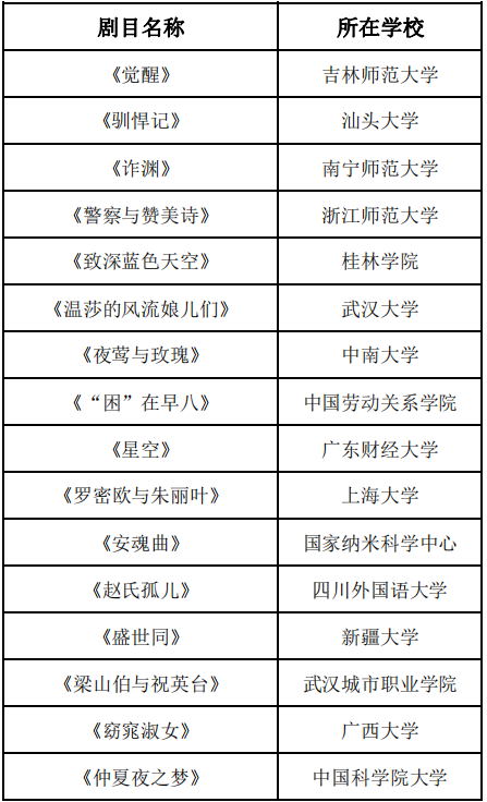 截止11月12日,本届戏剧节共吸引了来自全国各地20多所高校的外语学子或戏剧社团组队报名参赛,作品形式多样,作品主题以小见大、内涵丰富,展现了老员工的创作激情与青春朝气。经大赛组委会的初步评审,最终以下剧目脱颖而出,晋级决赛: