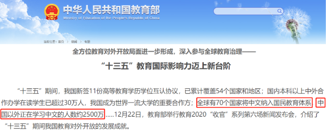 “十三五”展示了我国在“国际中文教育”发展上的成就,全球有70多个国家将中文纳入国民教育体系,国外正在学习中文的人数约2500万。随着中国国际地位和经济实力的不断提升,致使外国人学习中文的需求空前高涨。全球急需500万国际中文教师,而目前持证人数不到6万,国际中文教育人才严重匮乏。